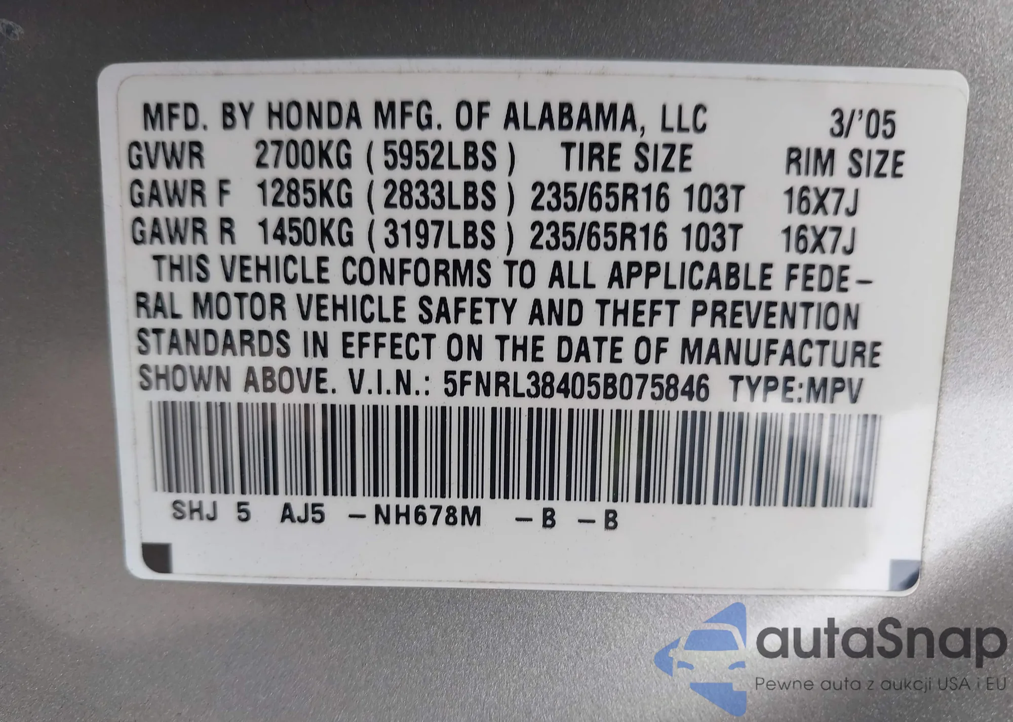• VIN 5FNRL38405B075846