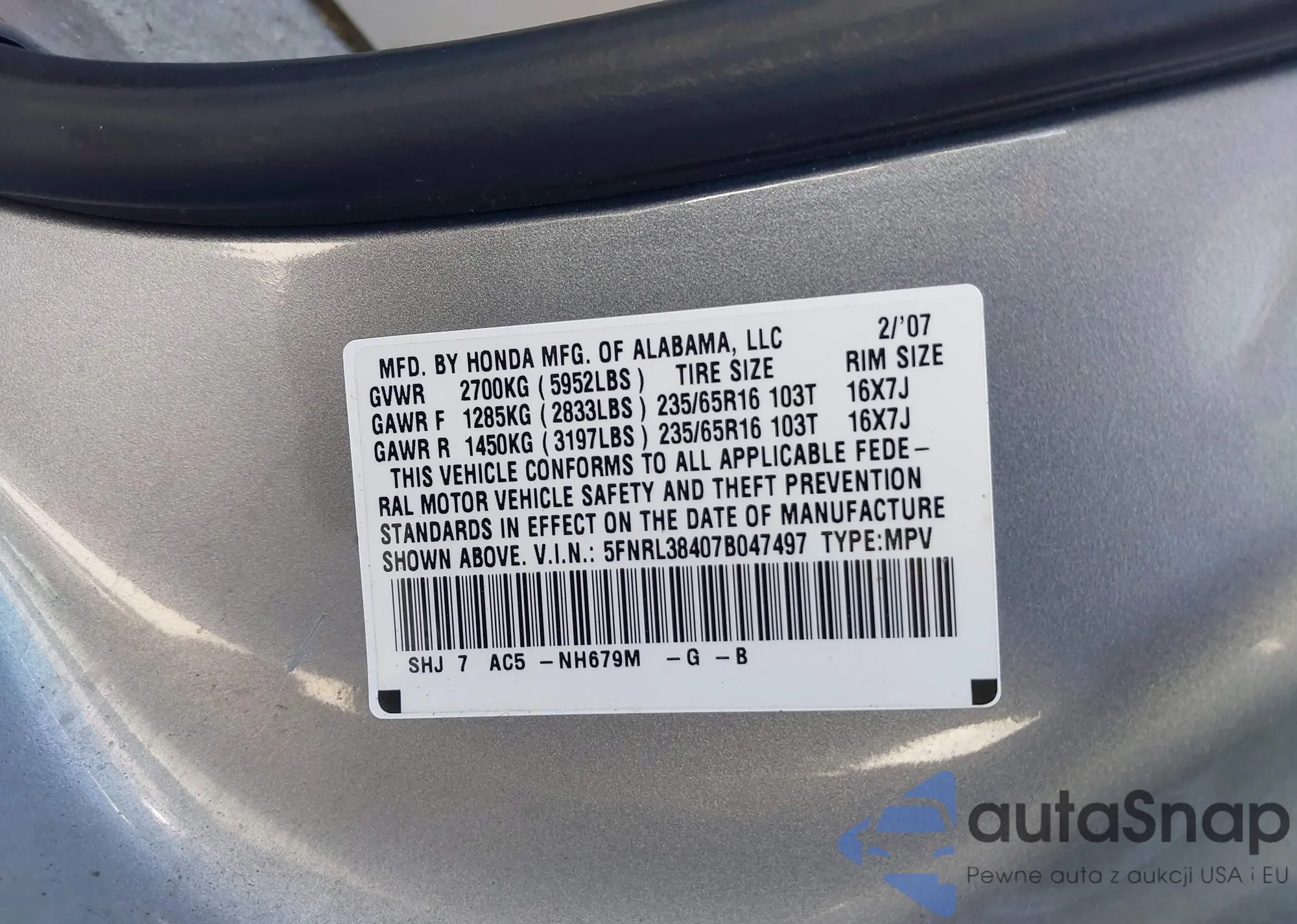 • VIN 5FNRL38407B047497