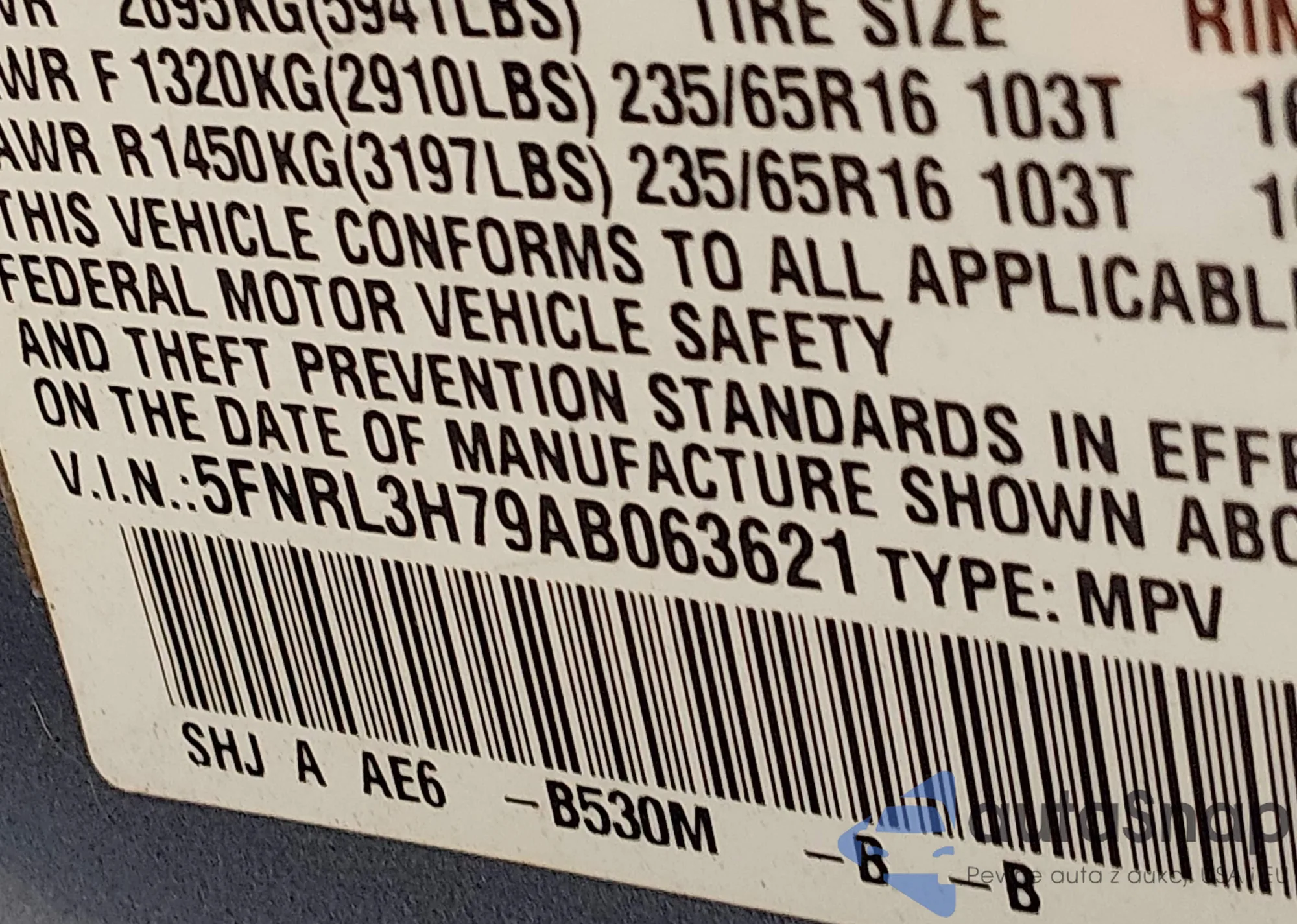 • VIN 5FNRL3H79AB063621