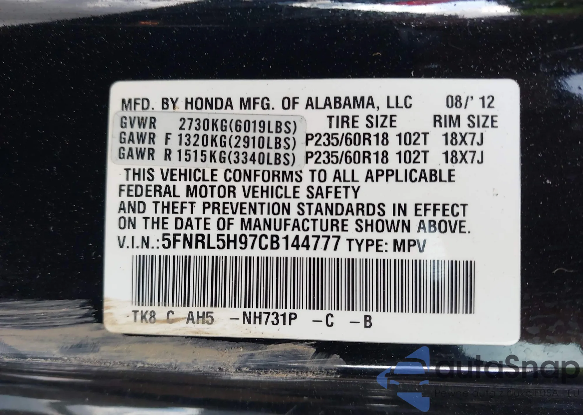 • VIN 5FNRL5H97CB144777