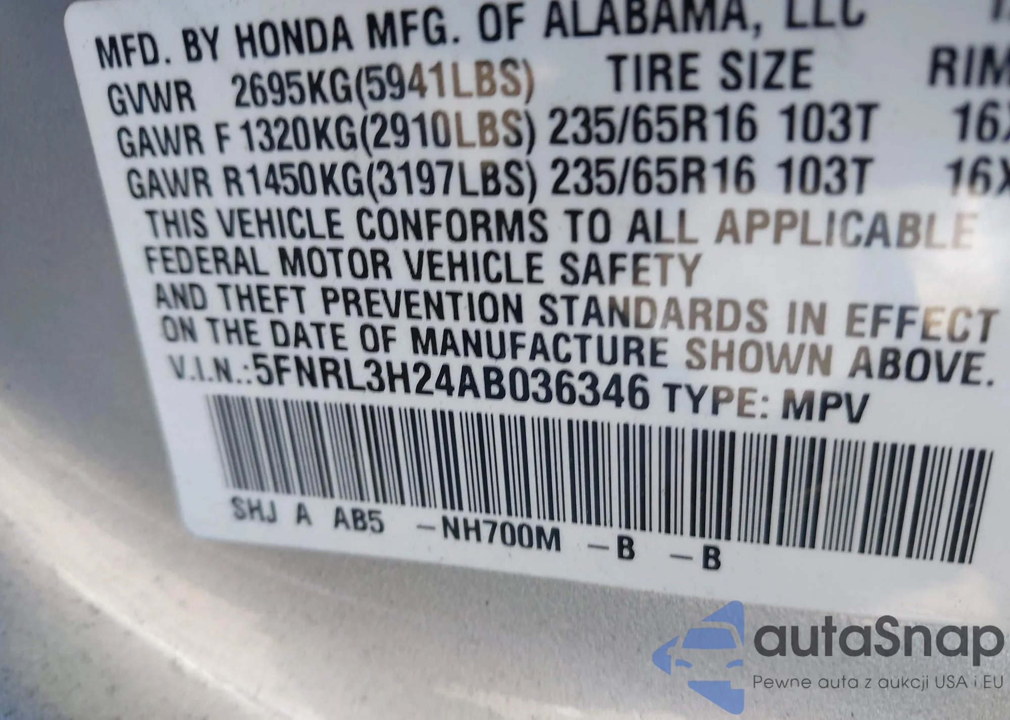 • VIN 5FNRL3H24AB036346