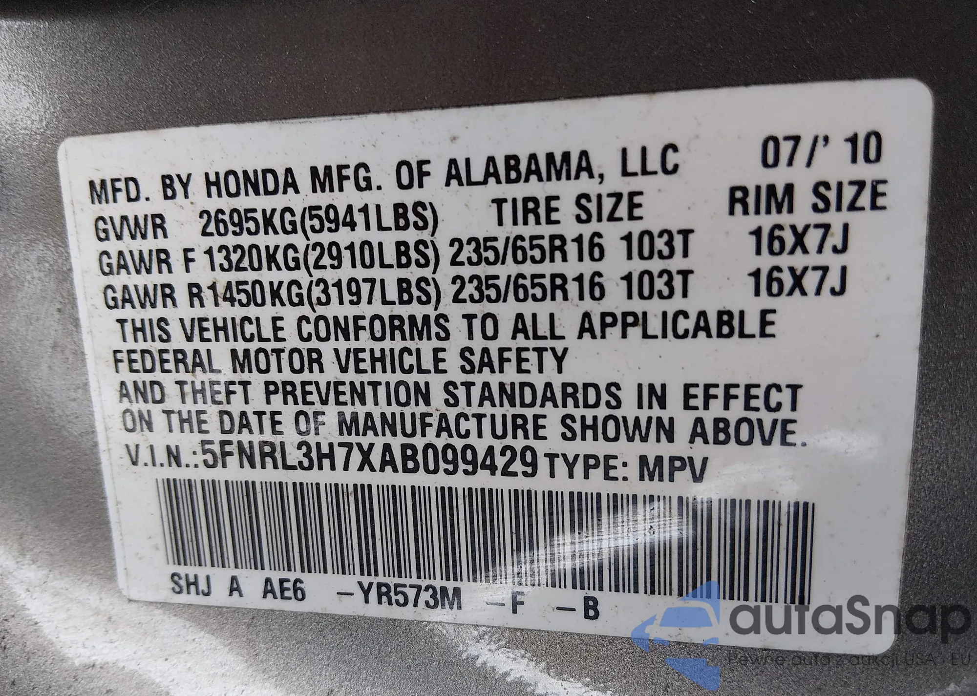 • VIN 5FNRL3H7XAB099429