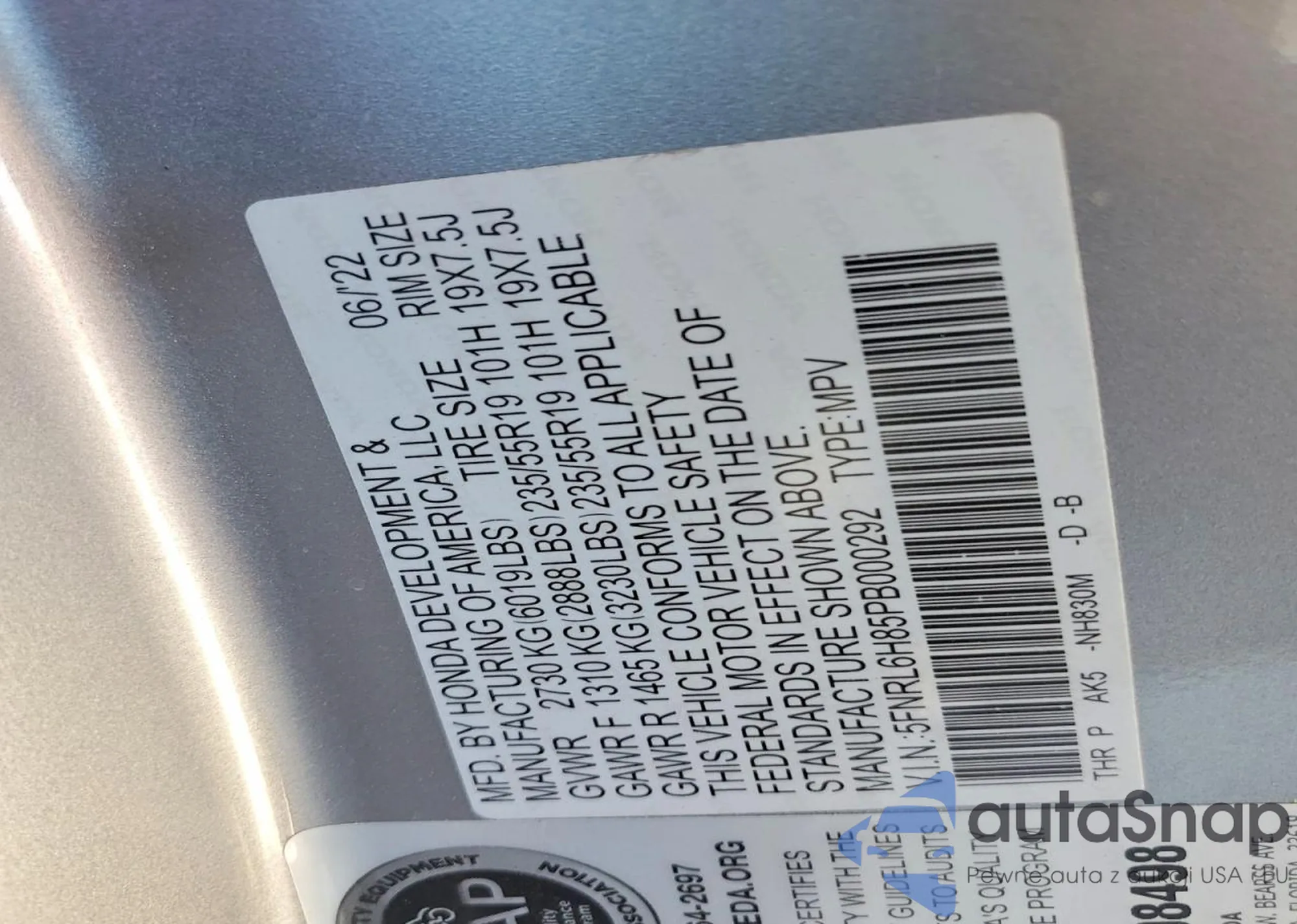 • VIN 5FNRL6H85PB000292
