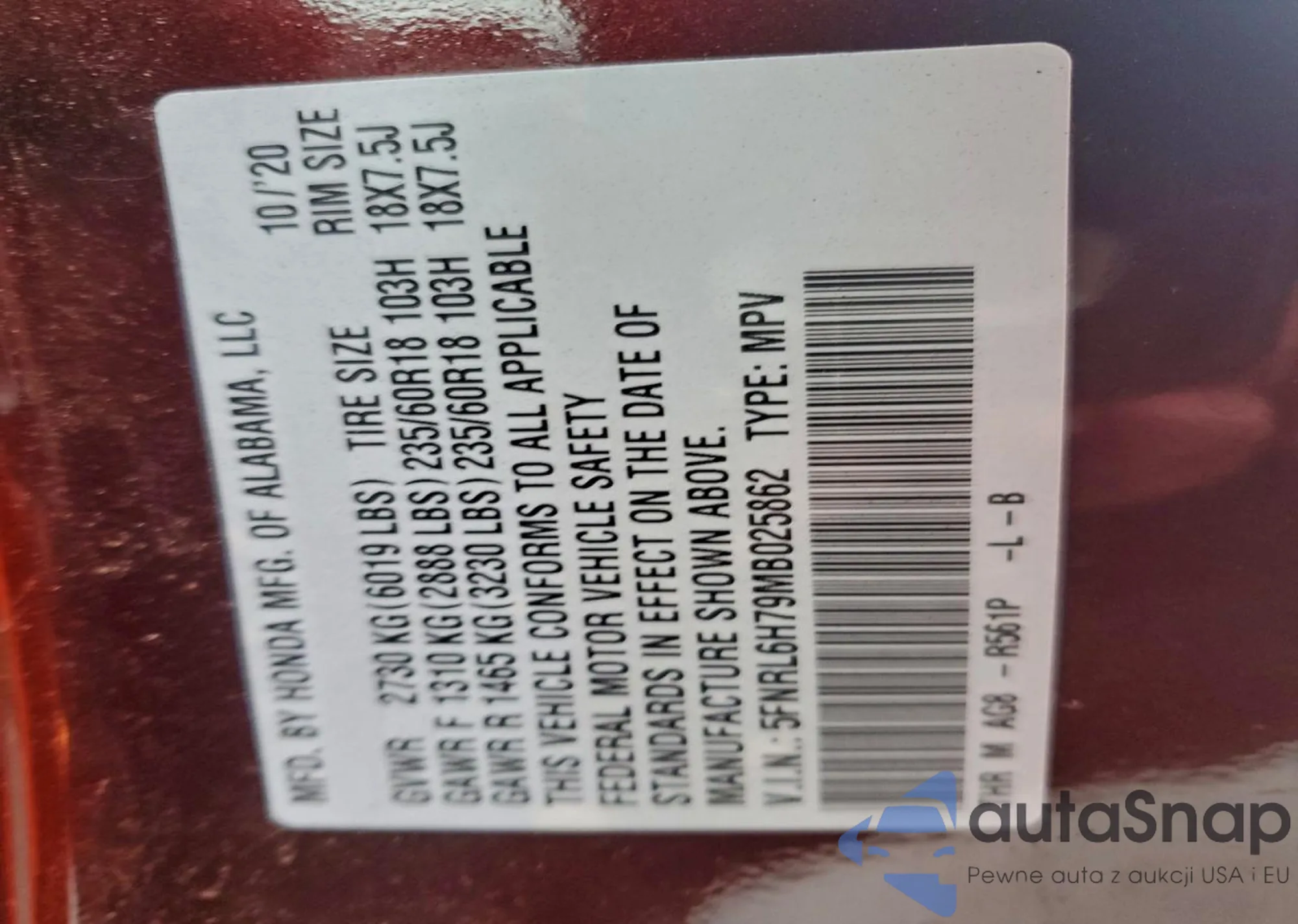• VIN 5FNRL5H64DB020165