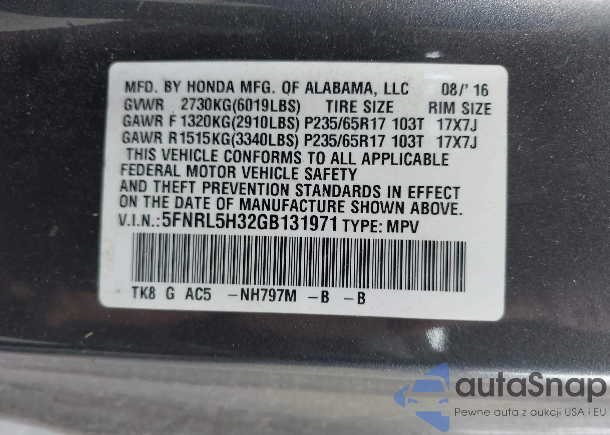 • VIN 5FNRL5H32GB131971