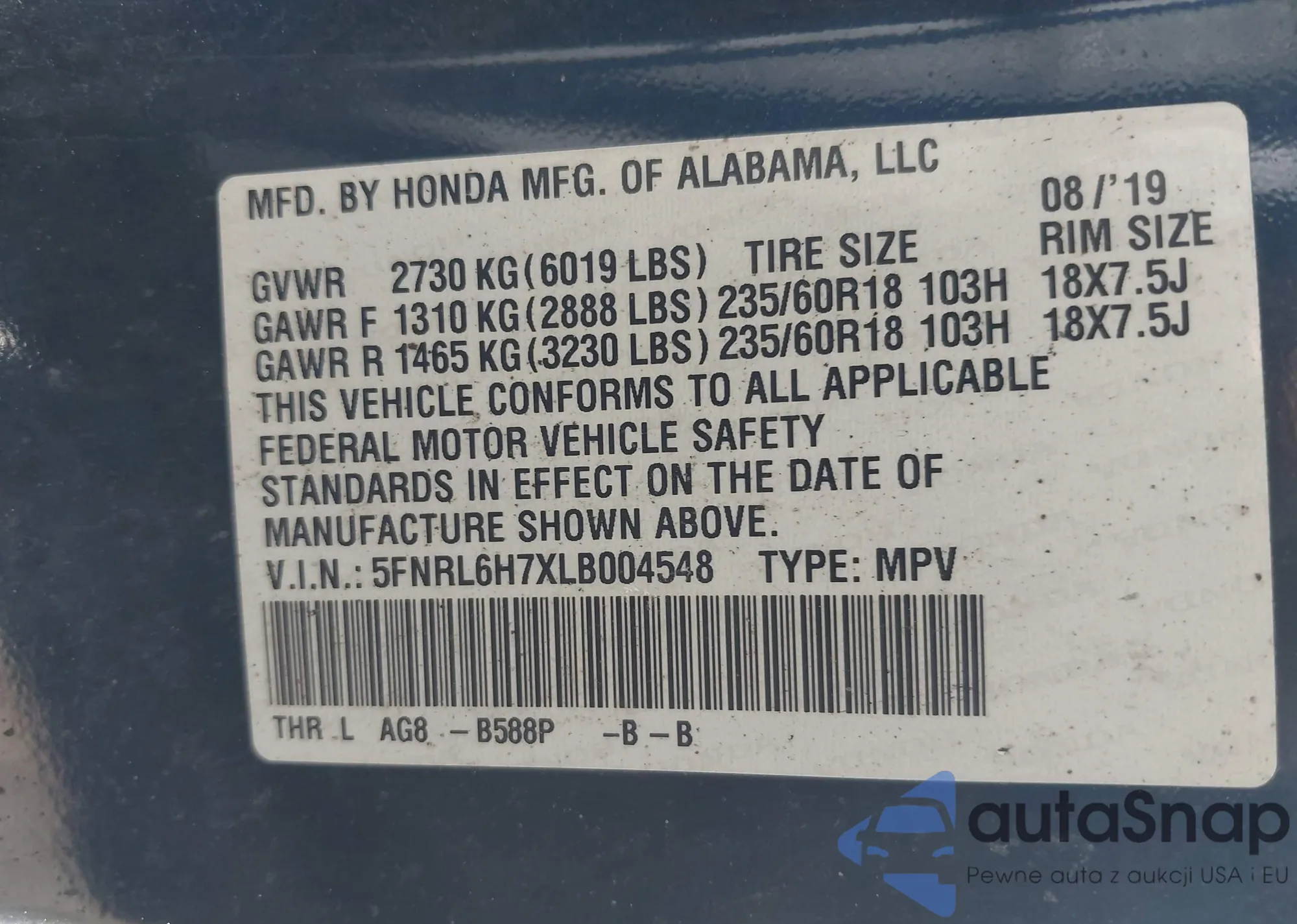 • VIN 5FNRL6H7XLB004548