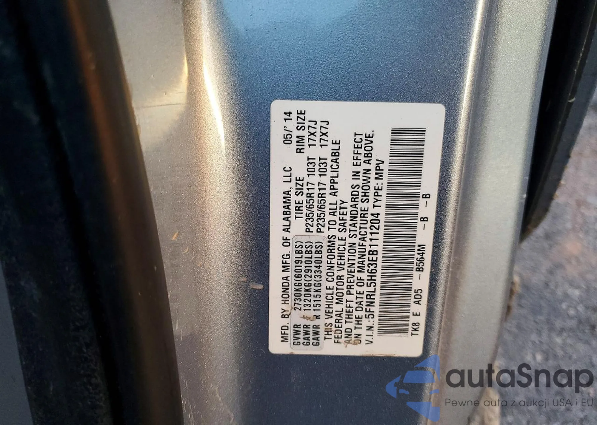 • VIN 5FNRL5H63EB111204