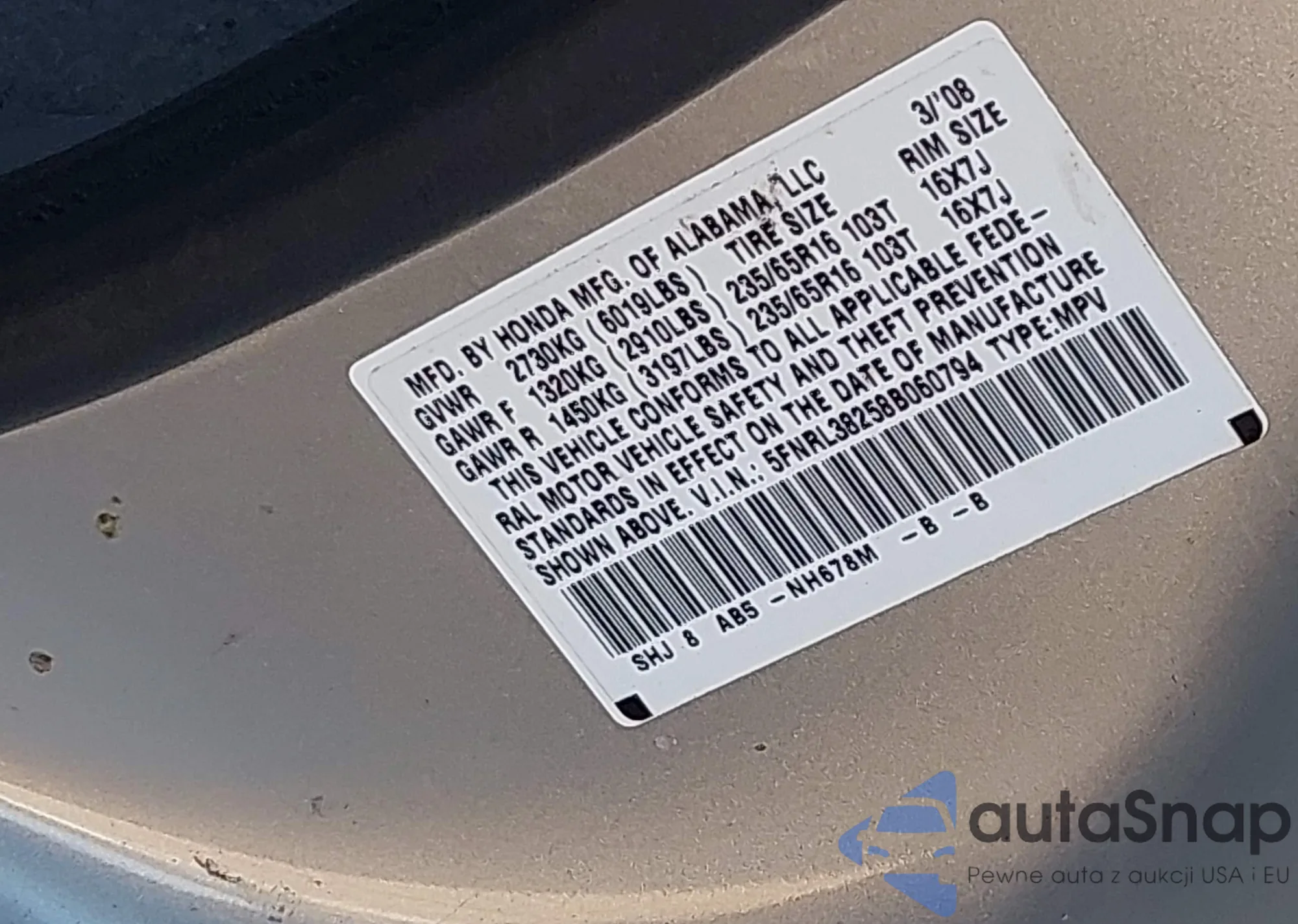 • VIN 5FNRL38258B060794