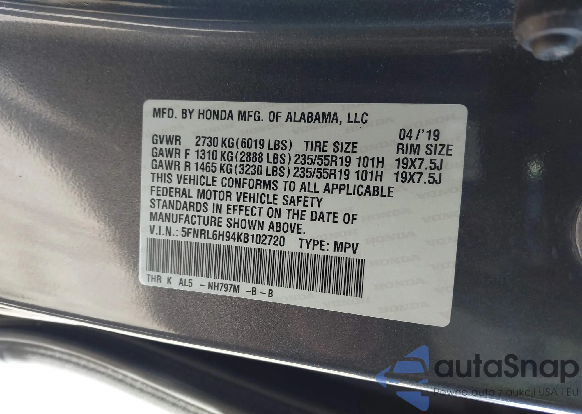 • VIN 5FNRL6H94KB102720