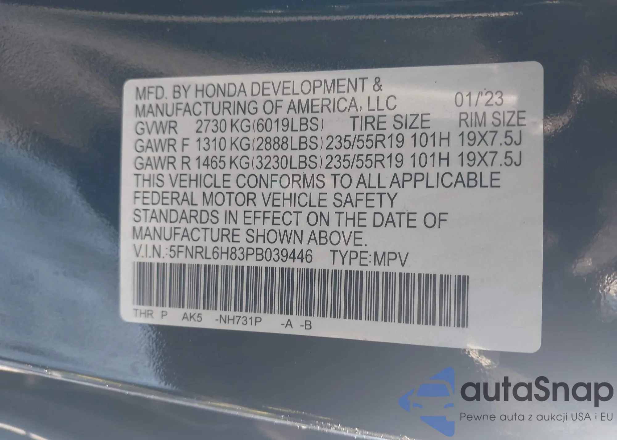 • VIN 5FNRL6H83PB039446