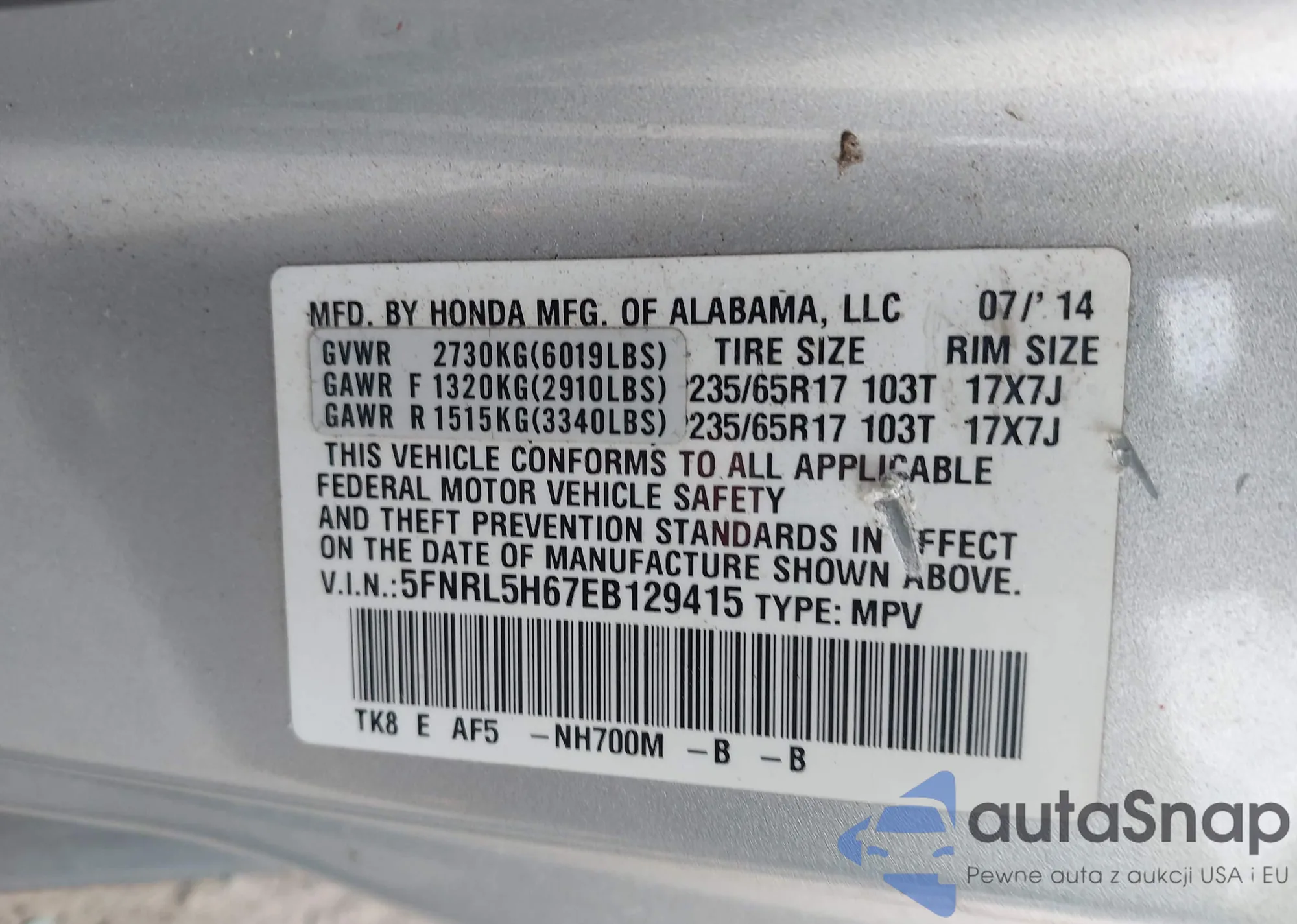 • VIN 5FNRL5H67EB129415