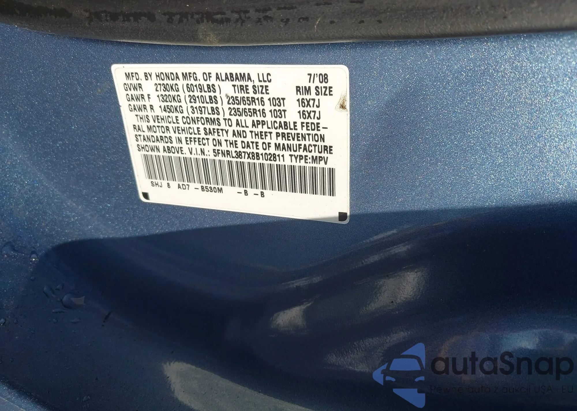 • VIN 5FNRL387X8B102811