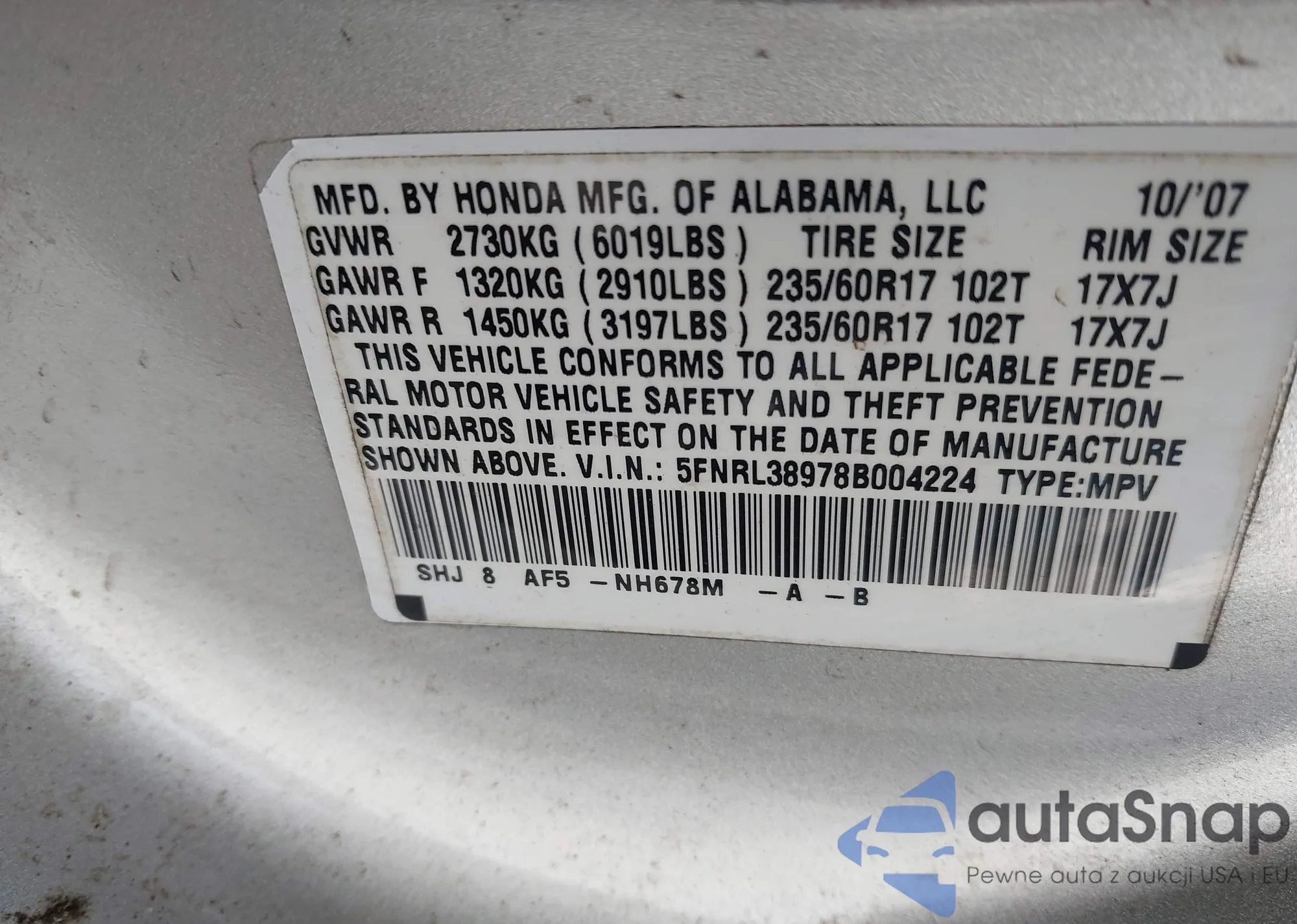 • VIN 5FNRL38978B004224