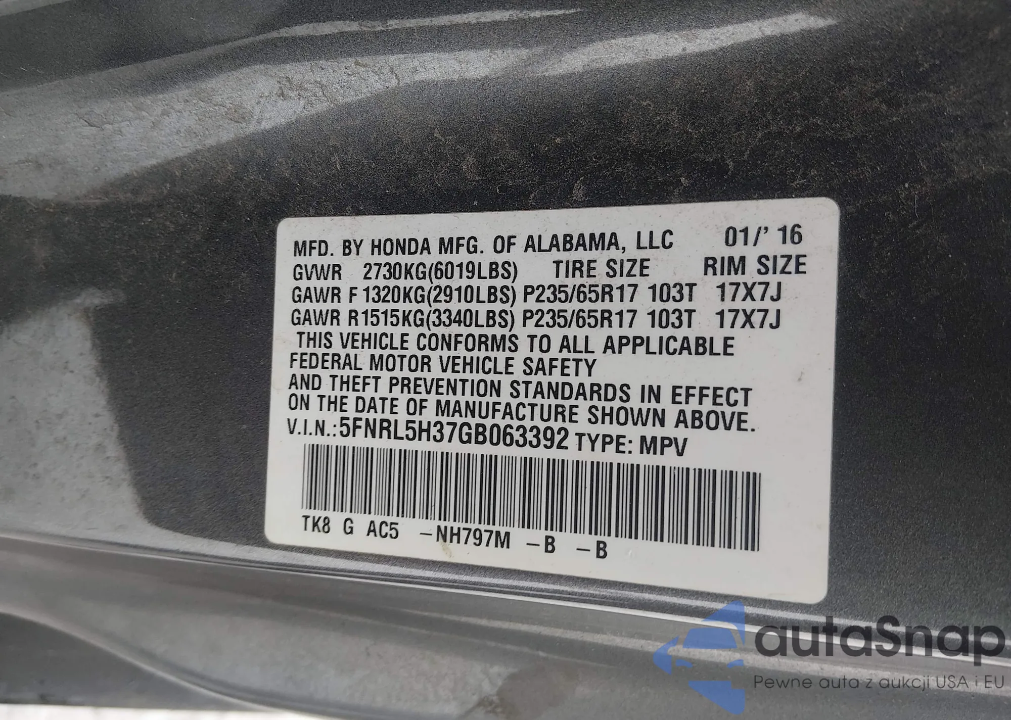 • VIN 5FNRL5H37GB063392