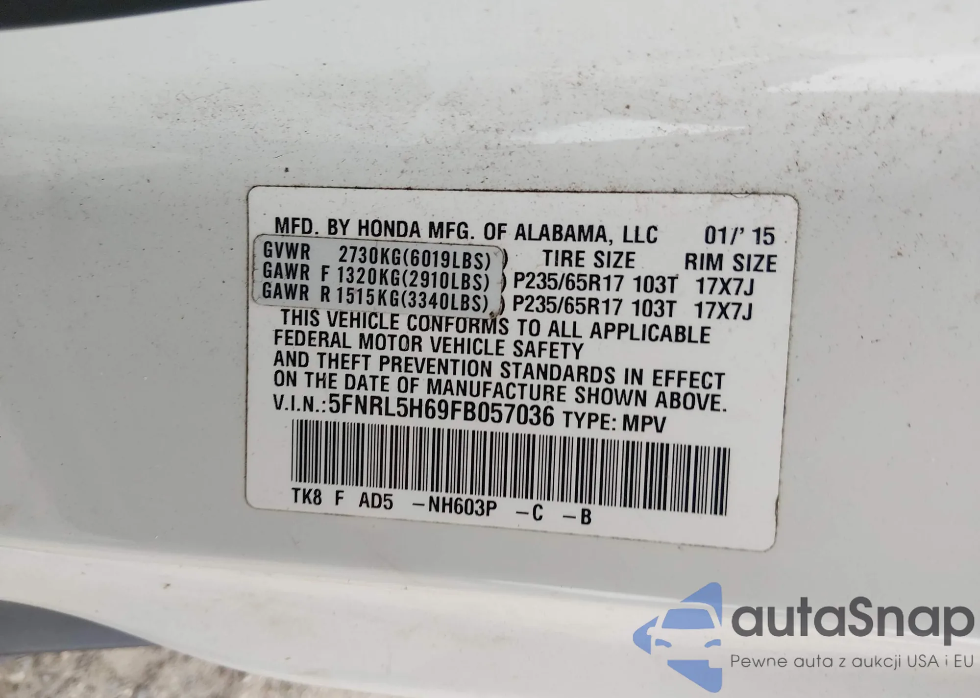 • VIN 5FNRL5H69FB057036