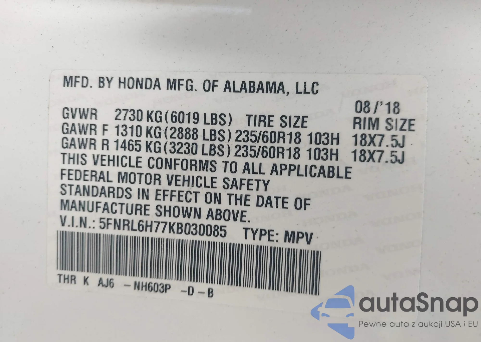 • VIN 5FNRL6H77KB030085