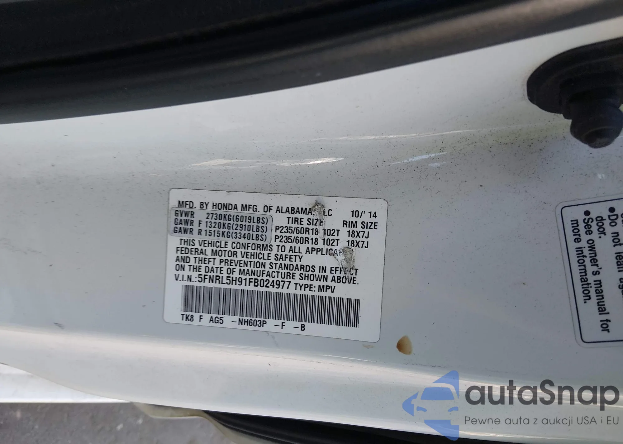 • VIN 5FNRL5H91FB024977