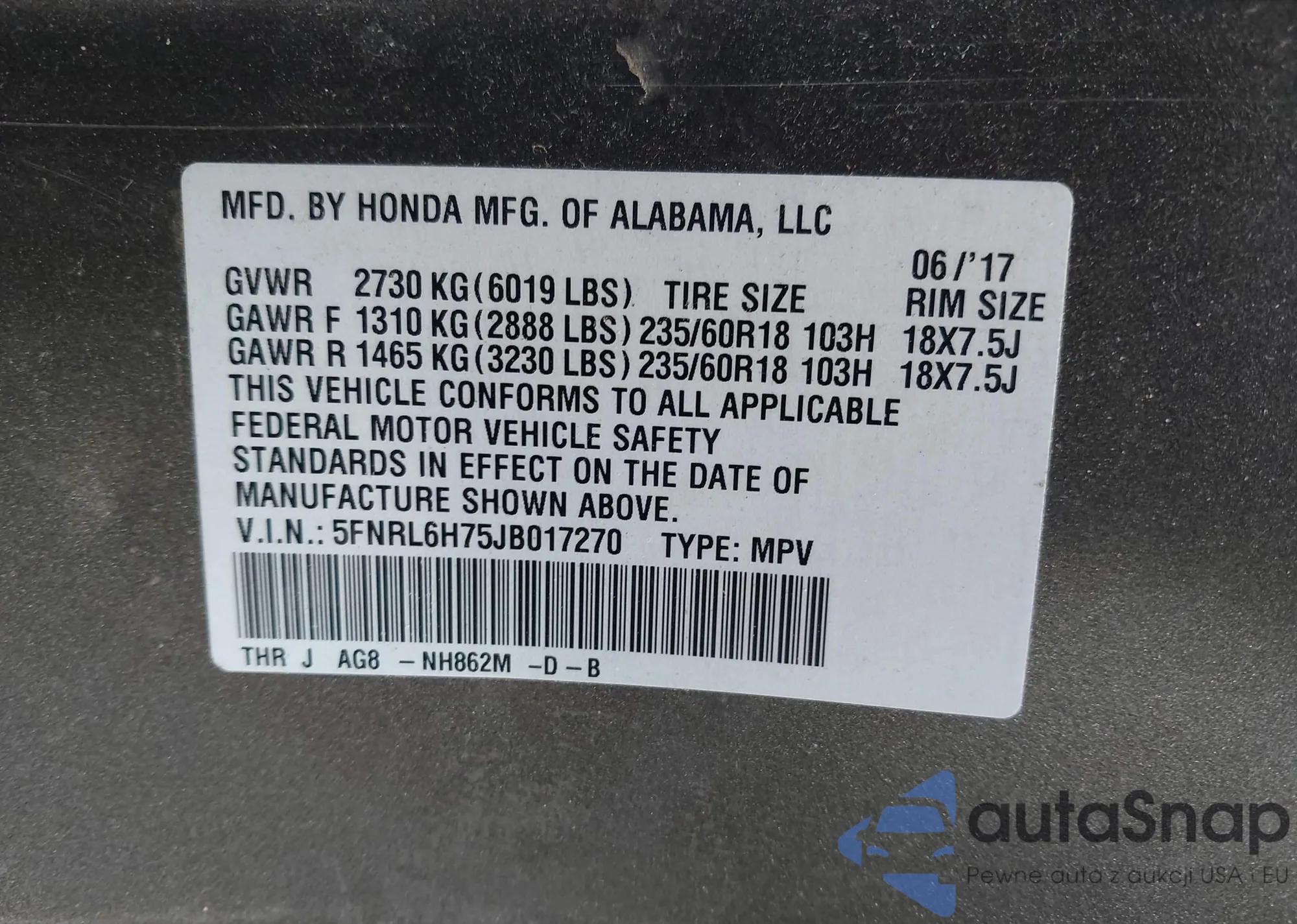 • VIN 5FNRL6H75JB017270