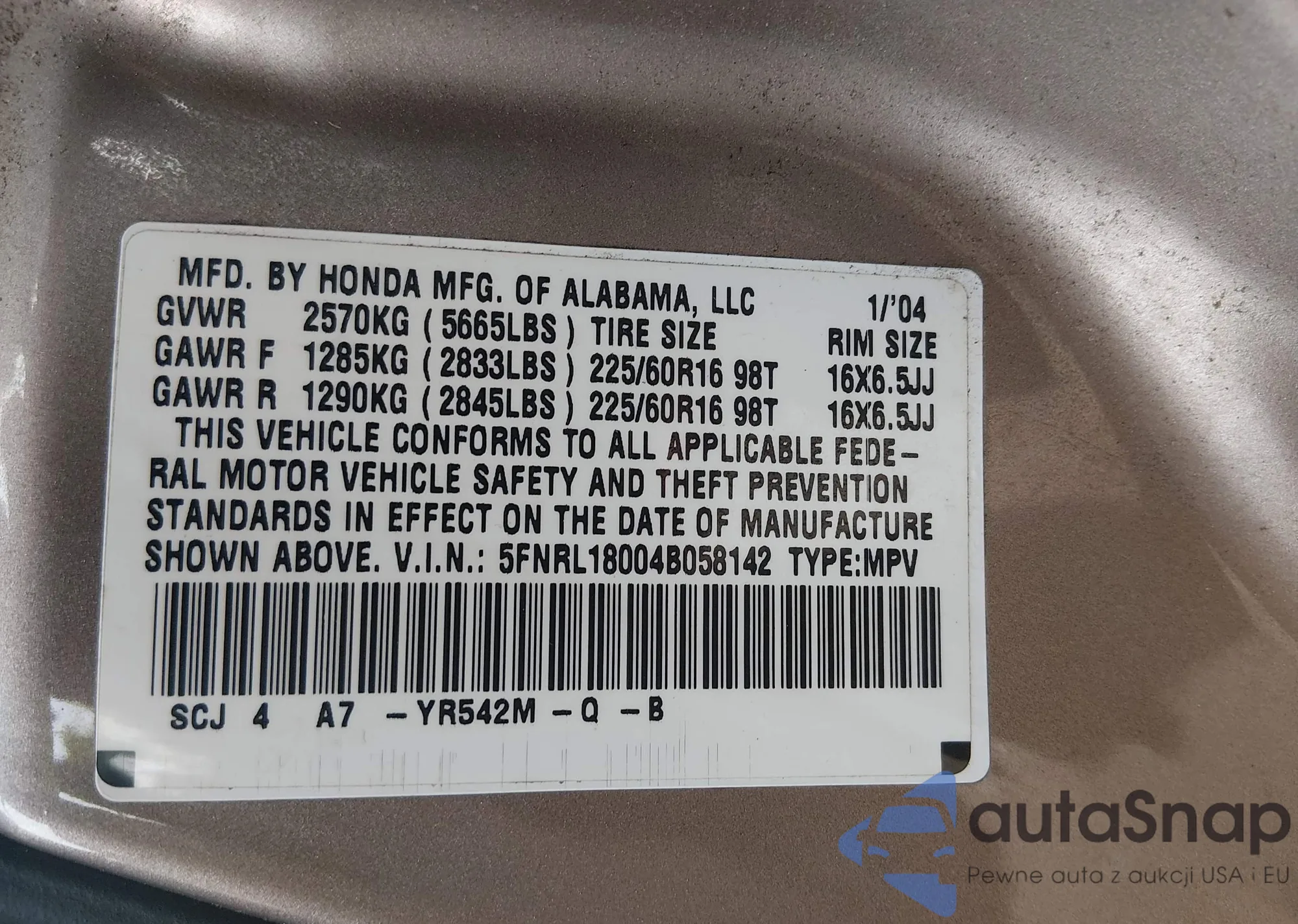 • VIN 5FNRL18004B058142