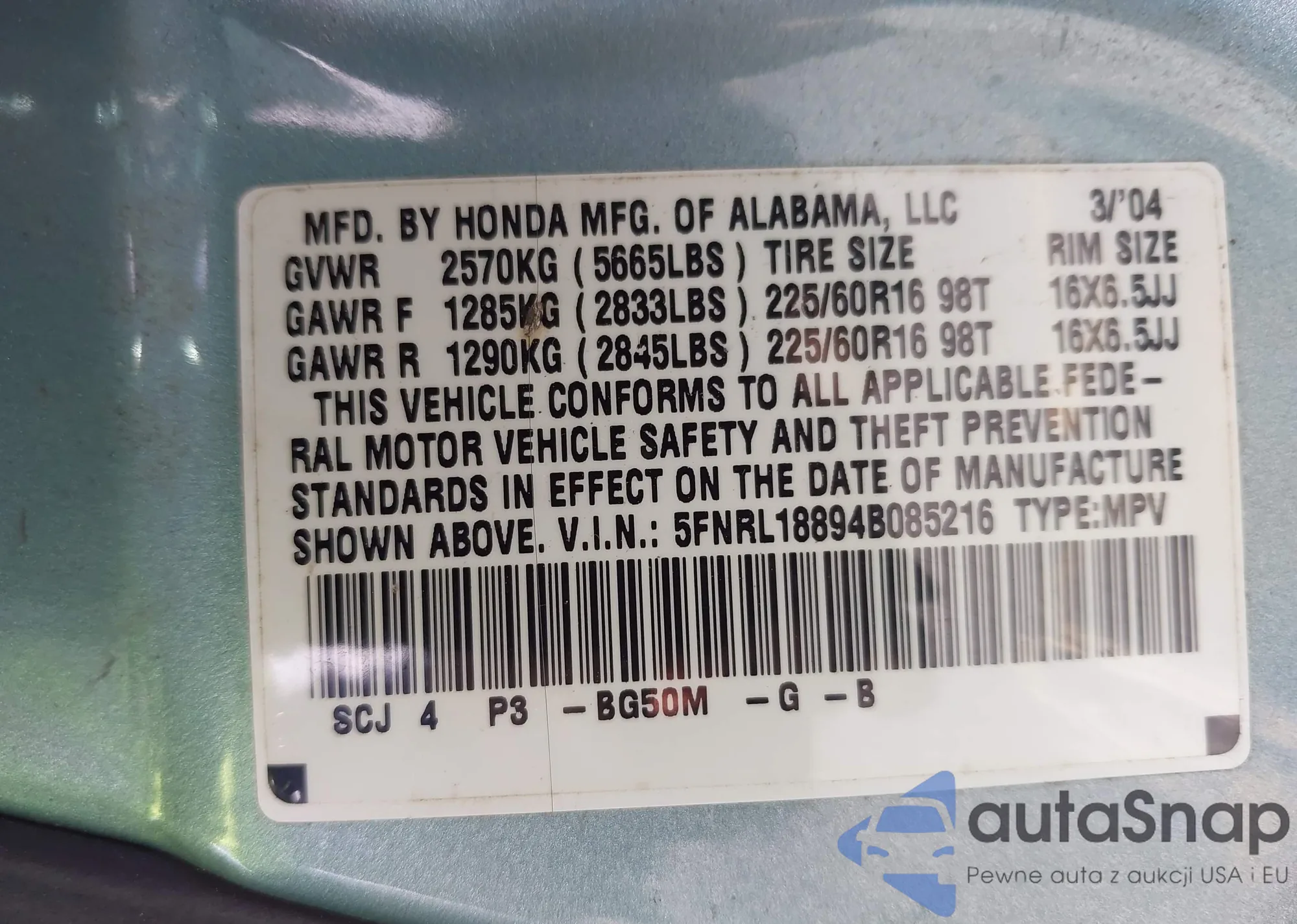 • VIN 5FNRL18894B085216