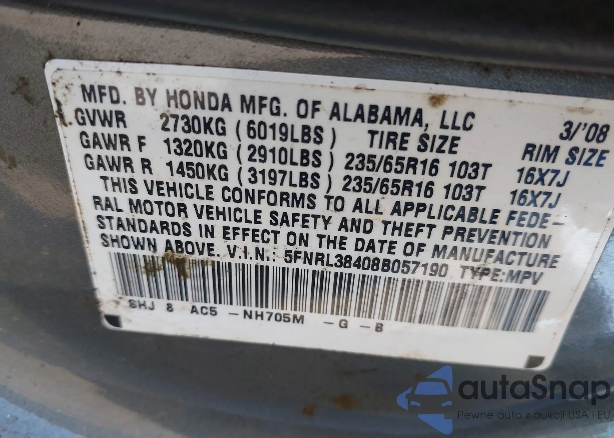 • VIN 5FNRL6H57MB020481