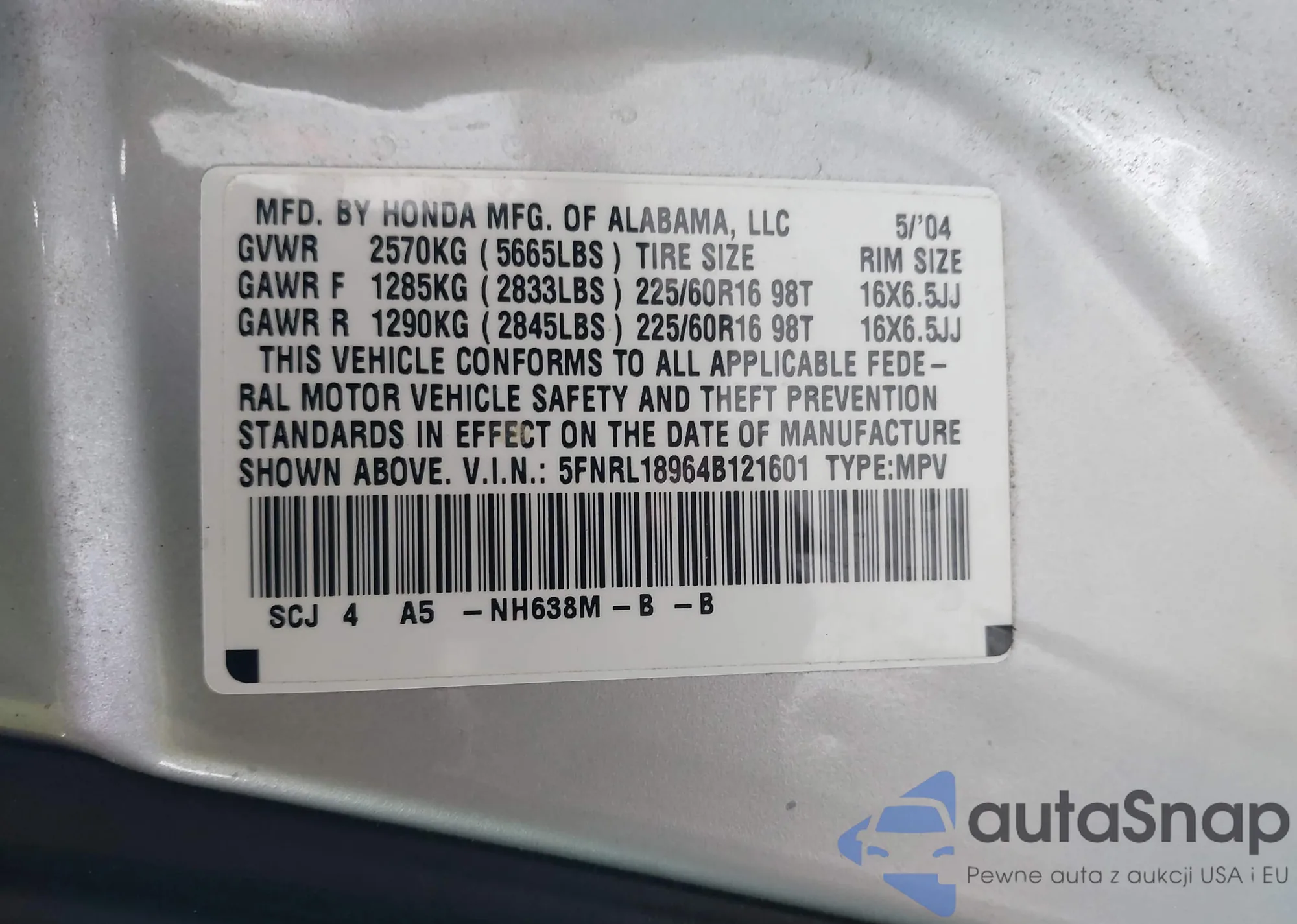 • VIN 5FNRL18964B121601