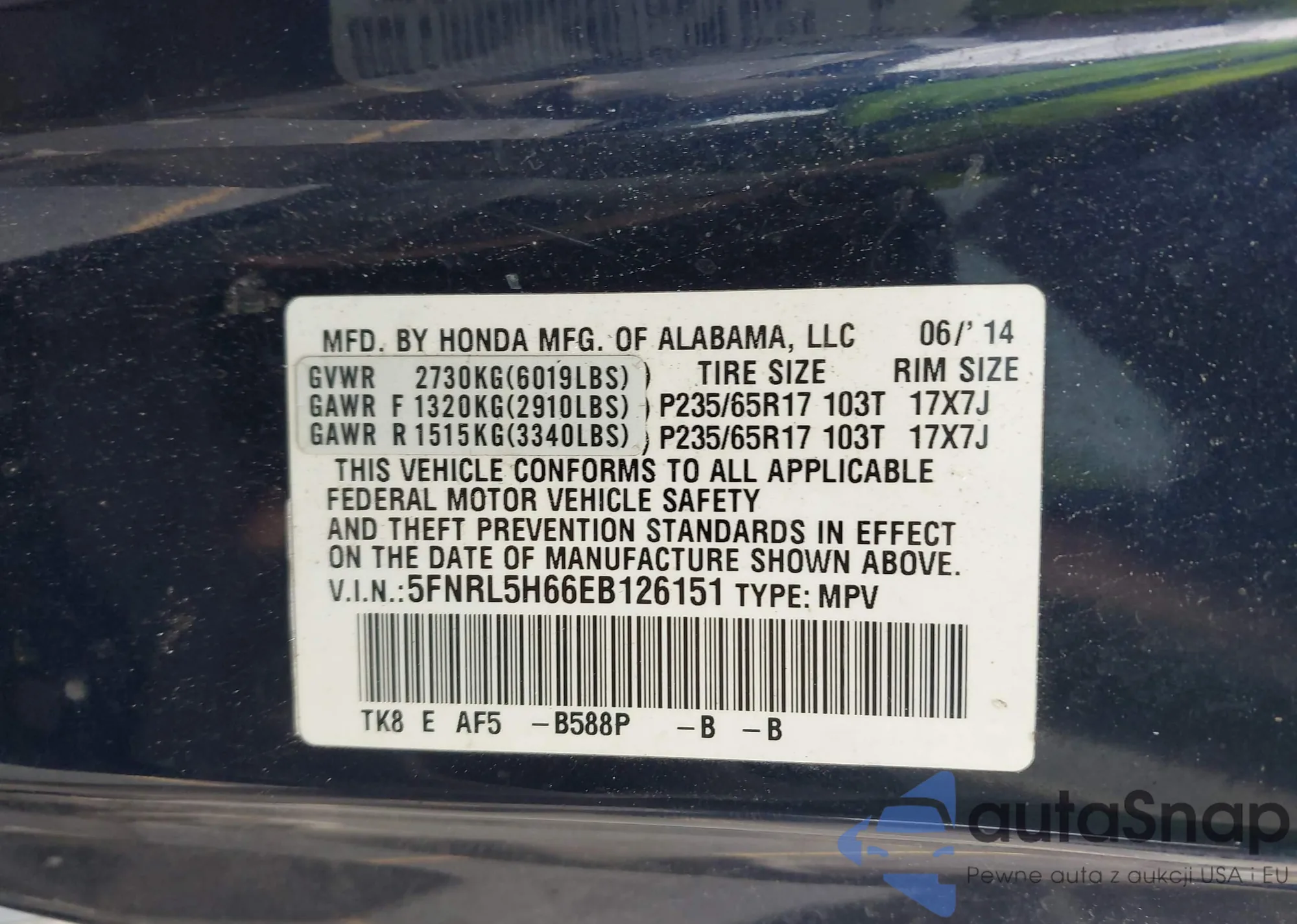 • VIN 5FNRL5H66EB126151