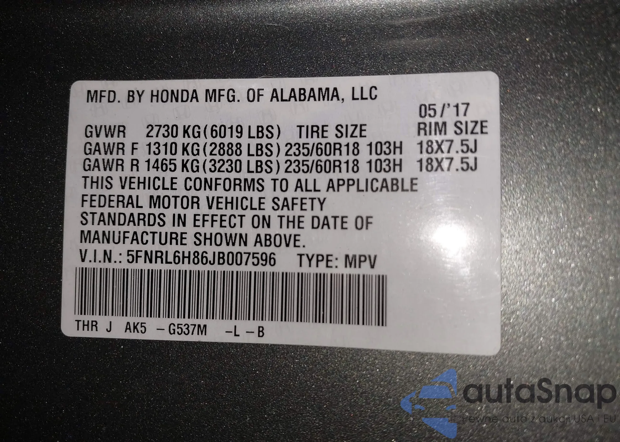 • VIN 5FNRL6H86JB007596