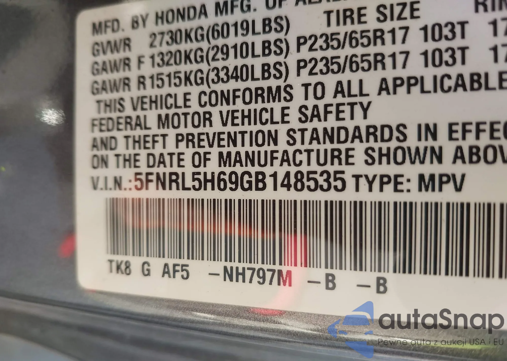 • VIN 5FNRL5H97FB045090
