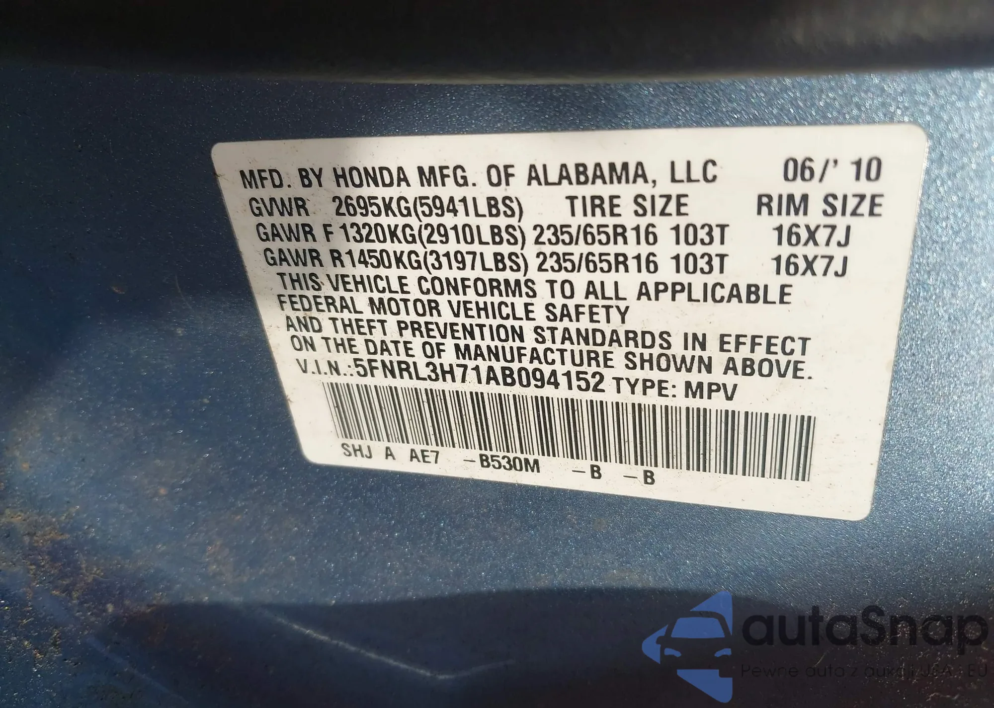 • VIN 5FNRL3H71AB094152