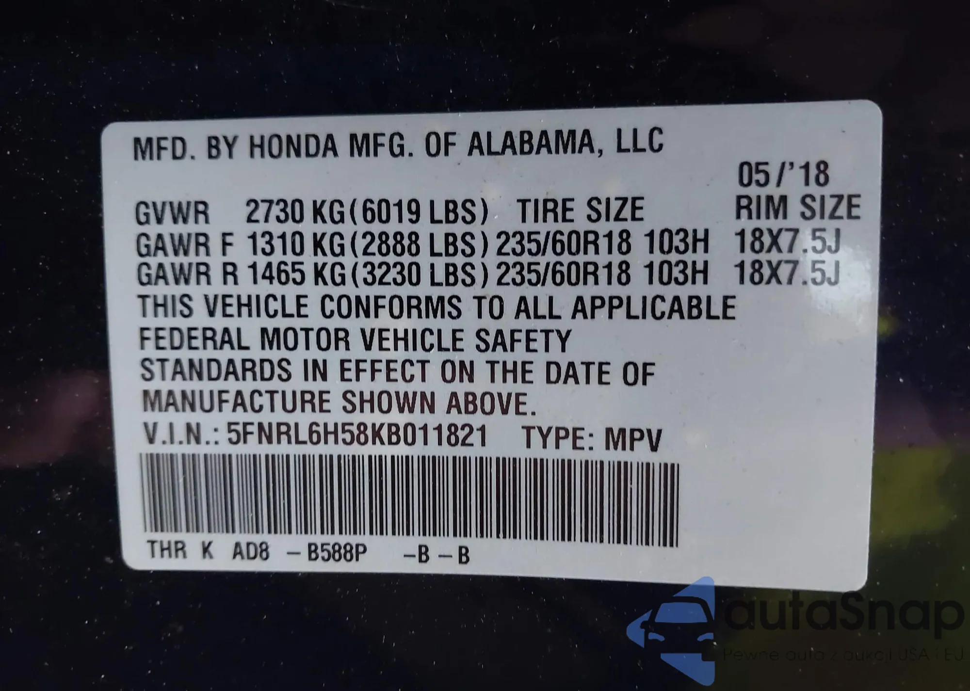 • VIN 5FNRL6H58KB011821