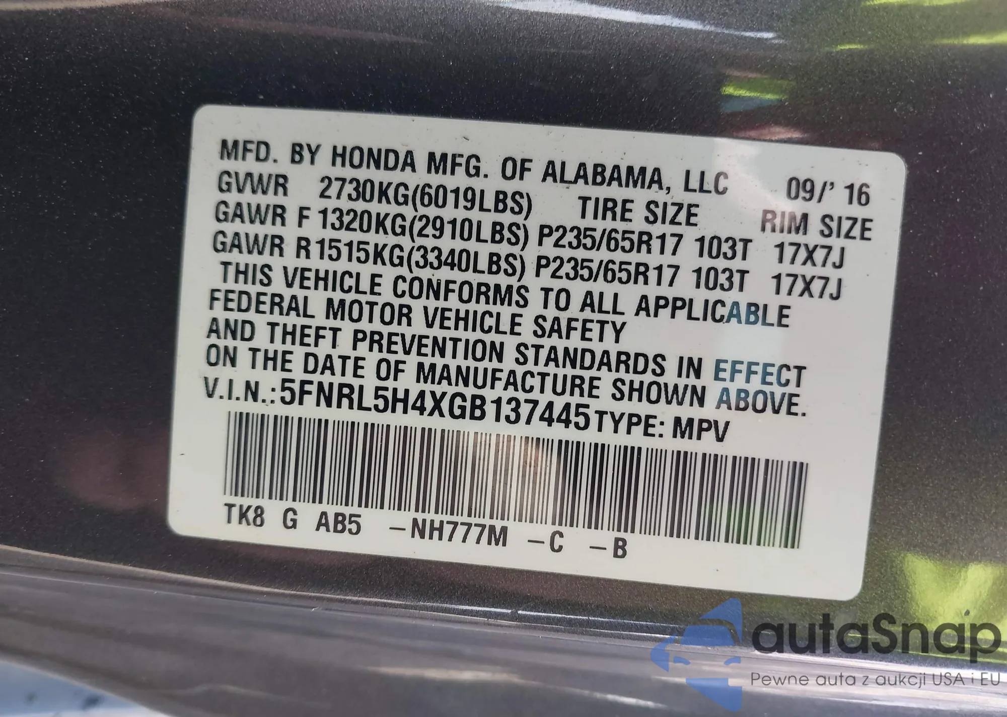 • VIN 5FNRL5H4XGB137445