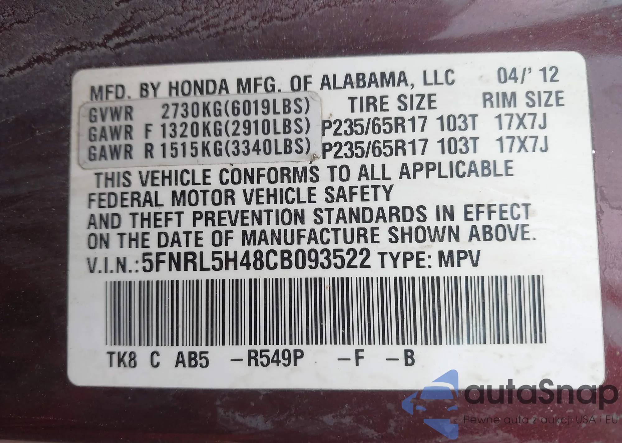 • VIN 5FNRL5H48CB093522