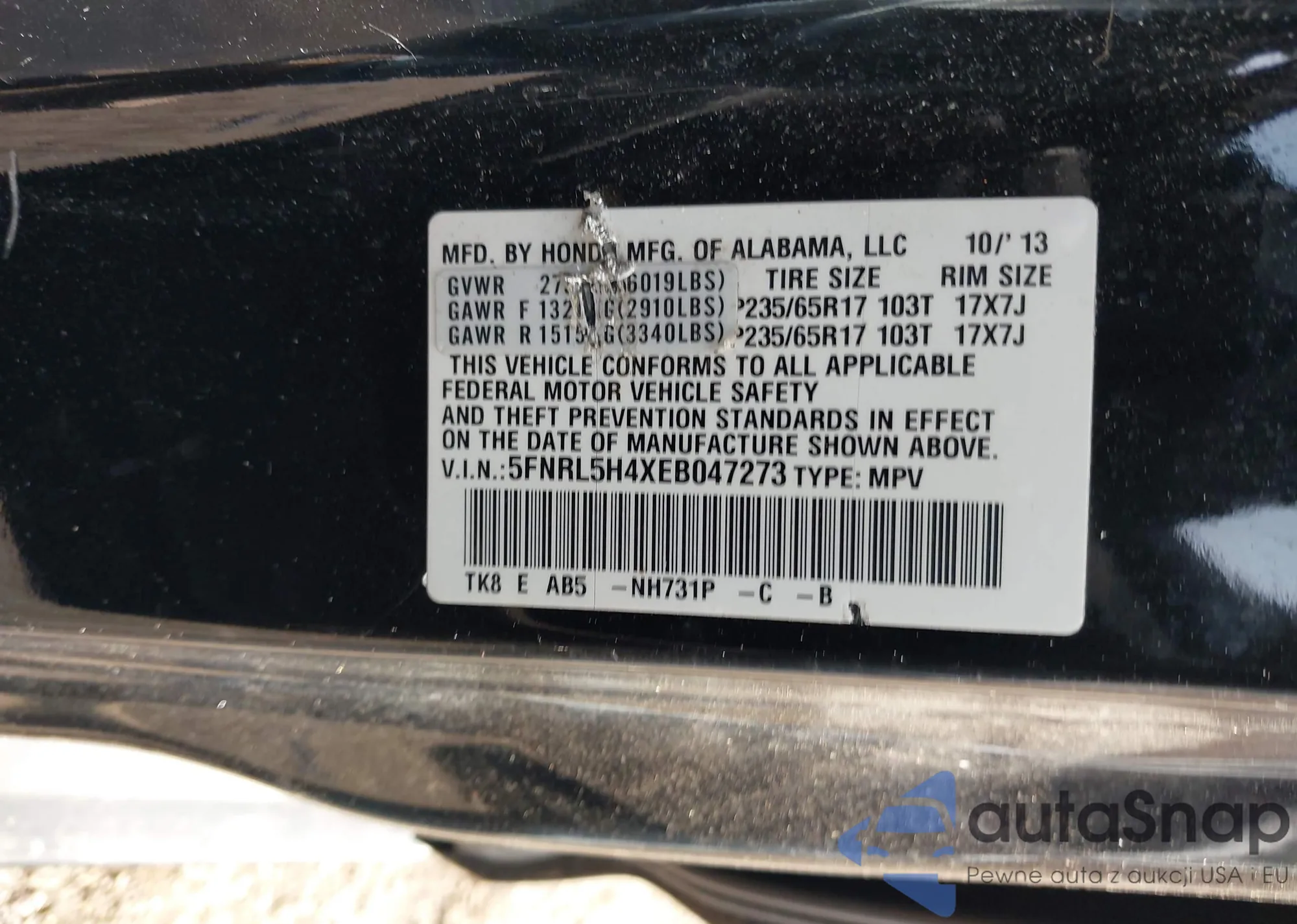• VIN 5FNRL5H4XEB047273