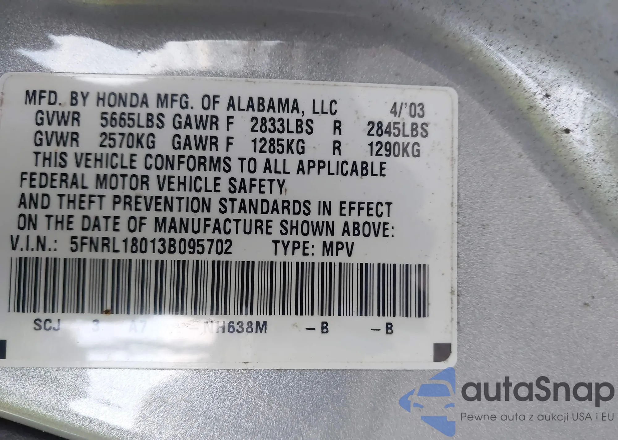 LOT: 44149551 VIN: 5FNRL18013B095702