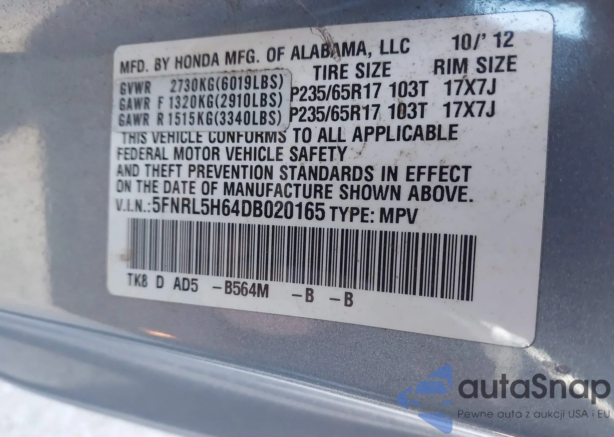 • VIN 5FNRL5H64DB020165