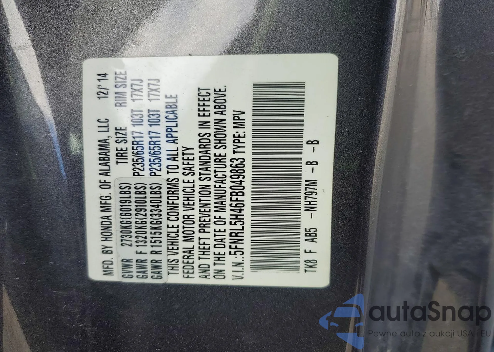 • VIN 5FNRL5H46FB049863