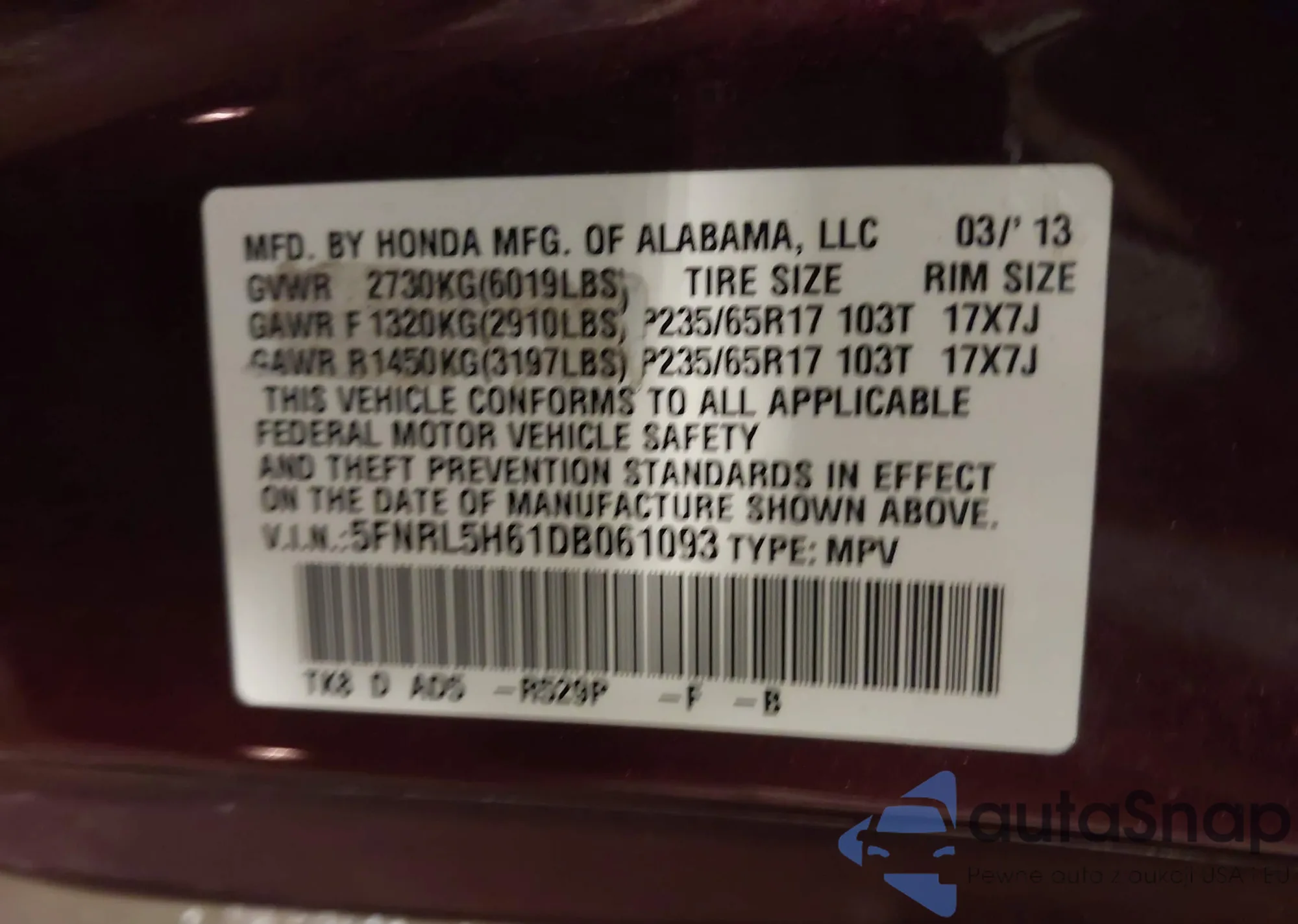 • VIN 2HKRM4H78DH601721