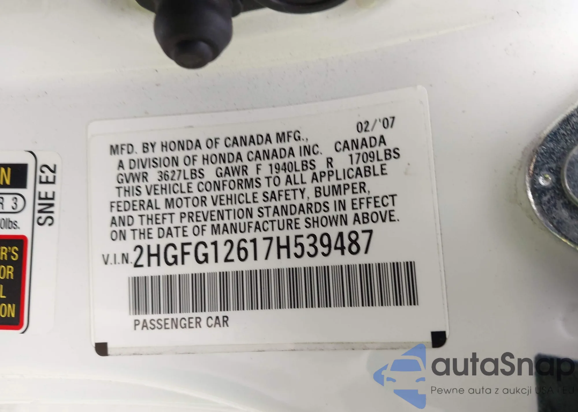 LOT: 44332447 VIN: 2HGFG12617H539487