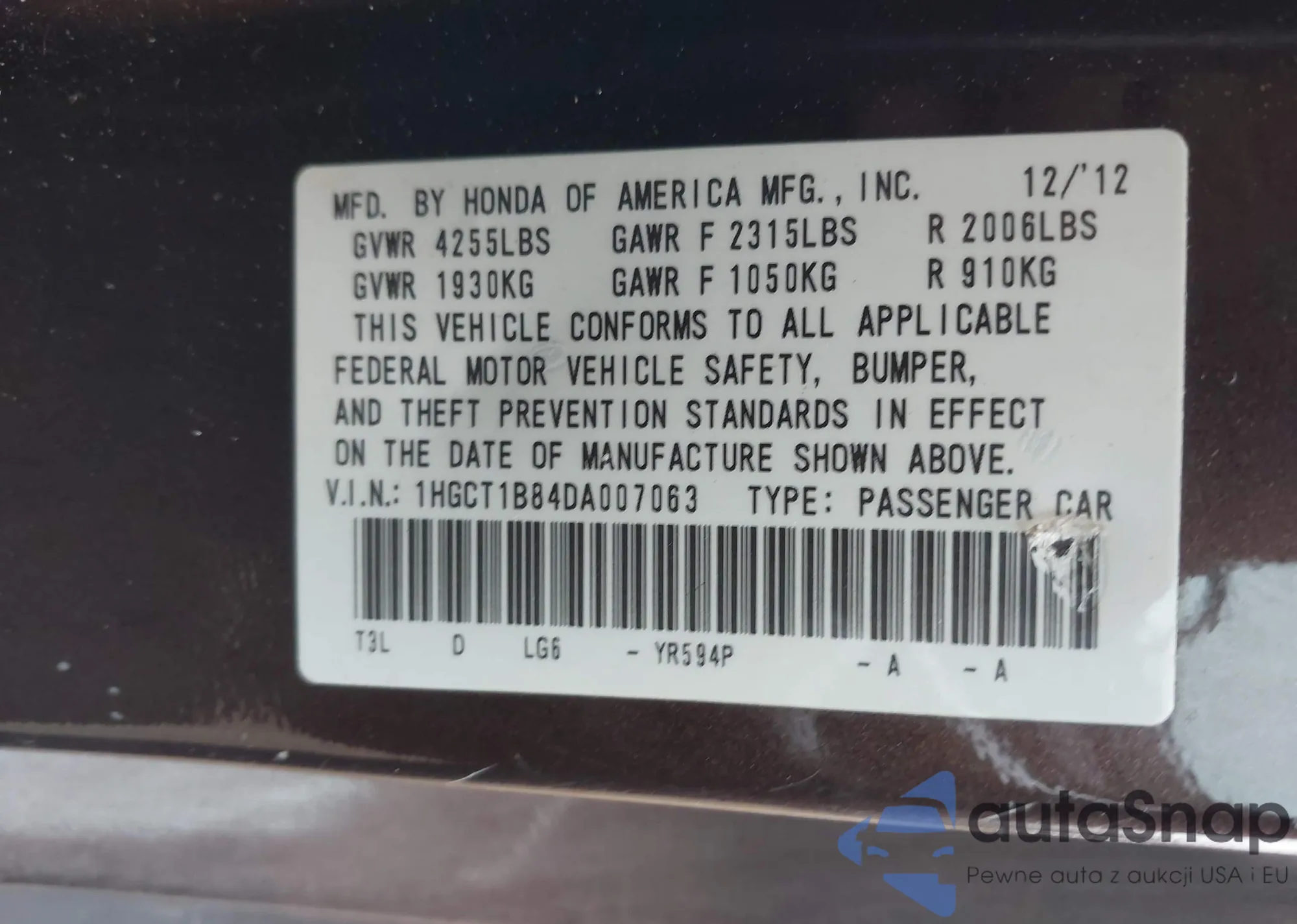 LOT: 43719887 VIN: 1HGCT1B84DA007063