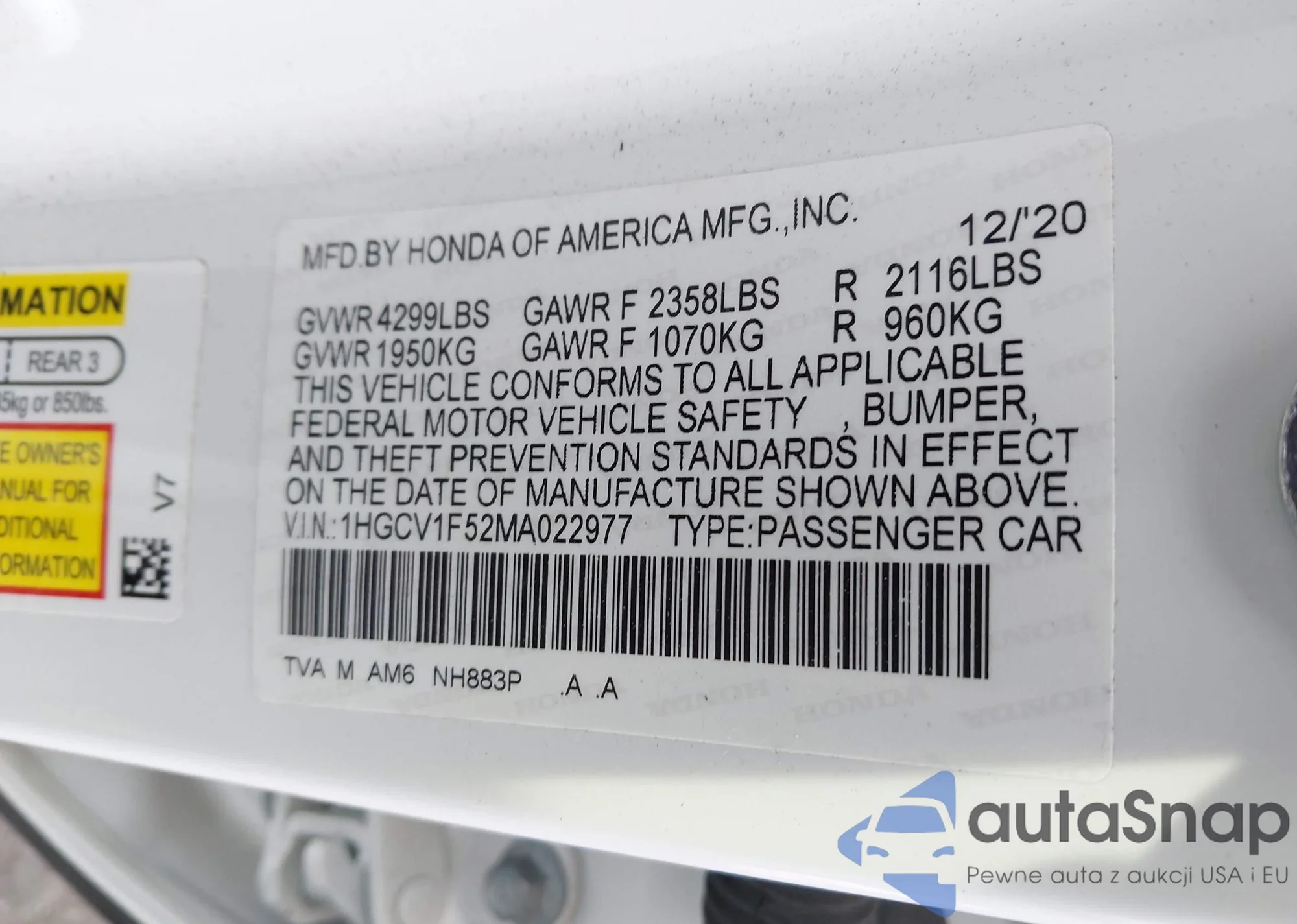 • VIN 1HGCV1F52MA022977