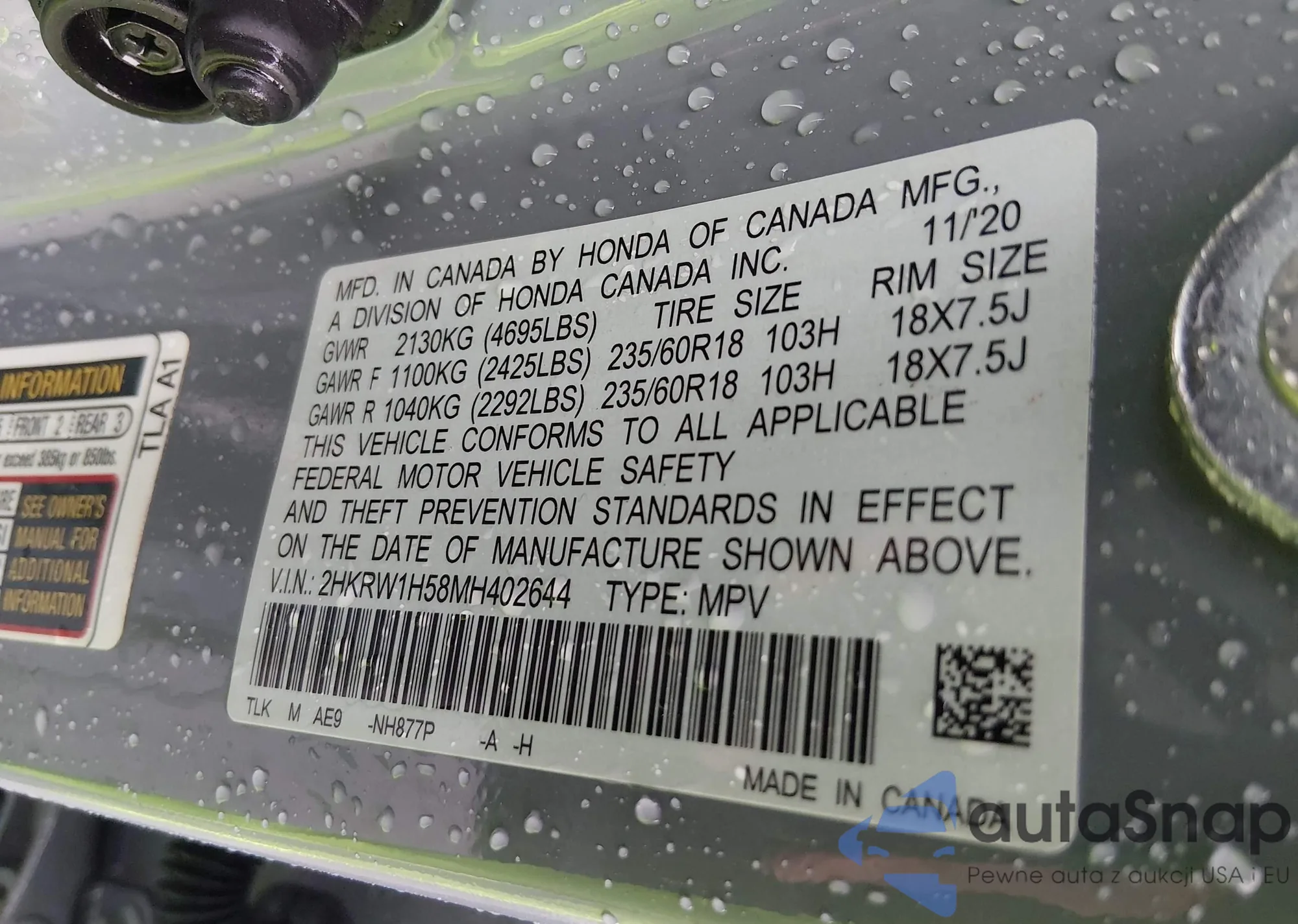 • VIN 2HKRW1H58MH402644