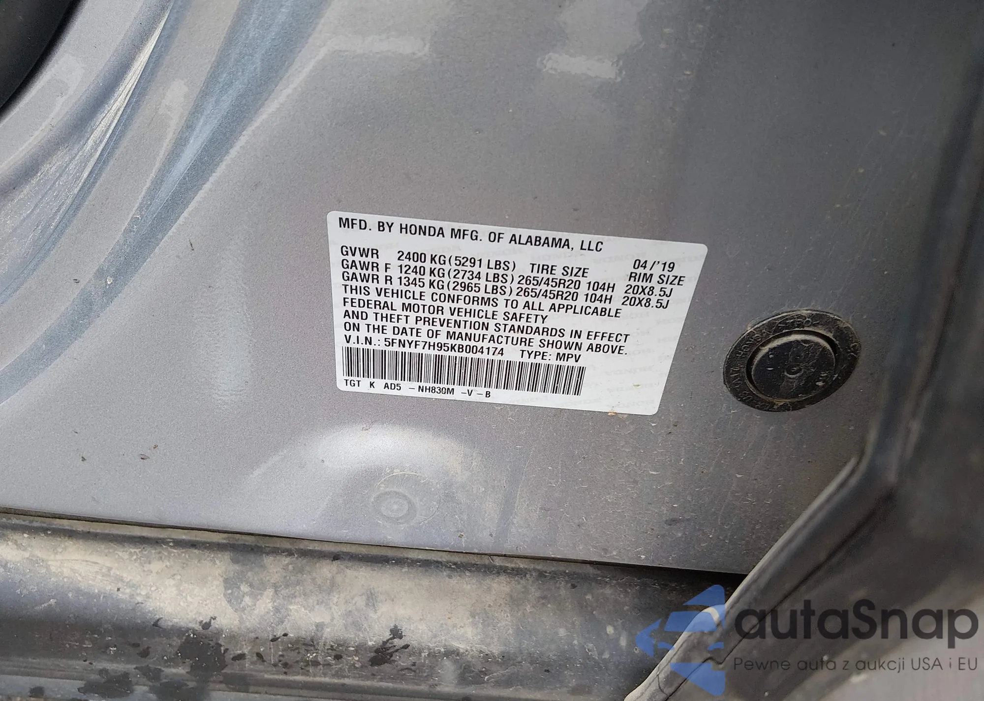 • VIN 5FNYF7H95KB004174