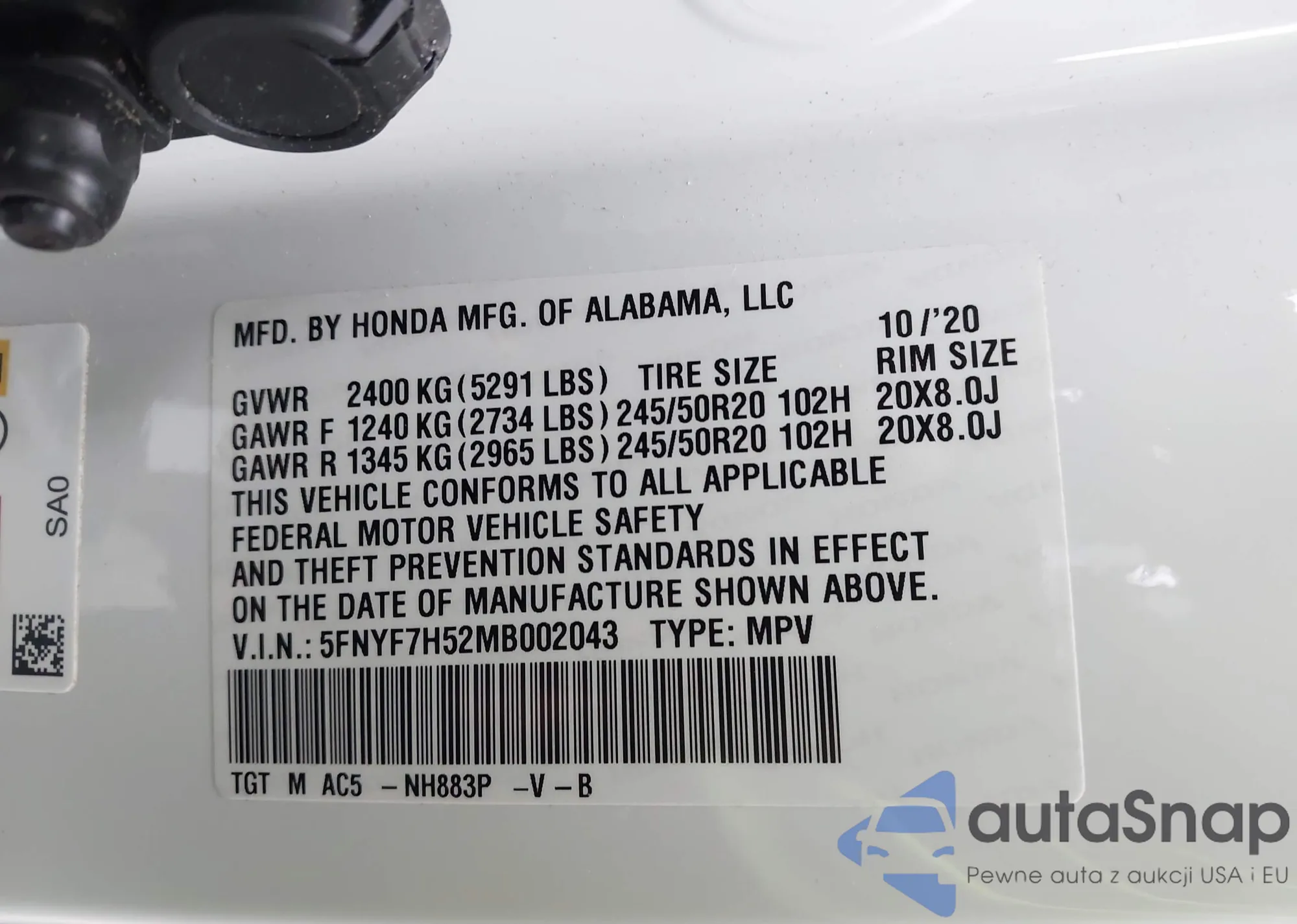 • VIN 5FNYF7H52MB002043