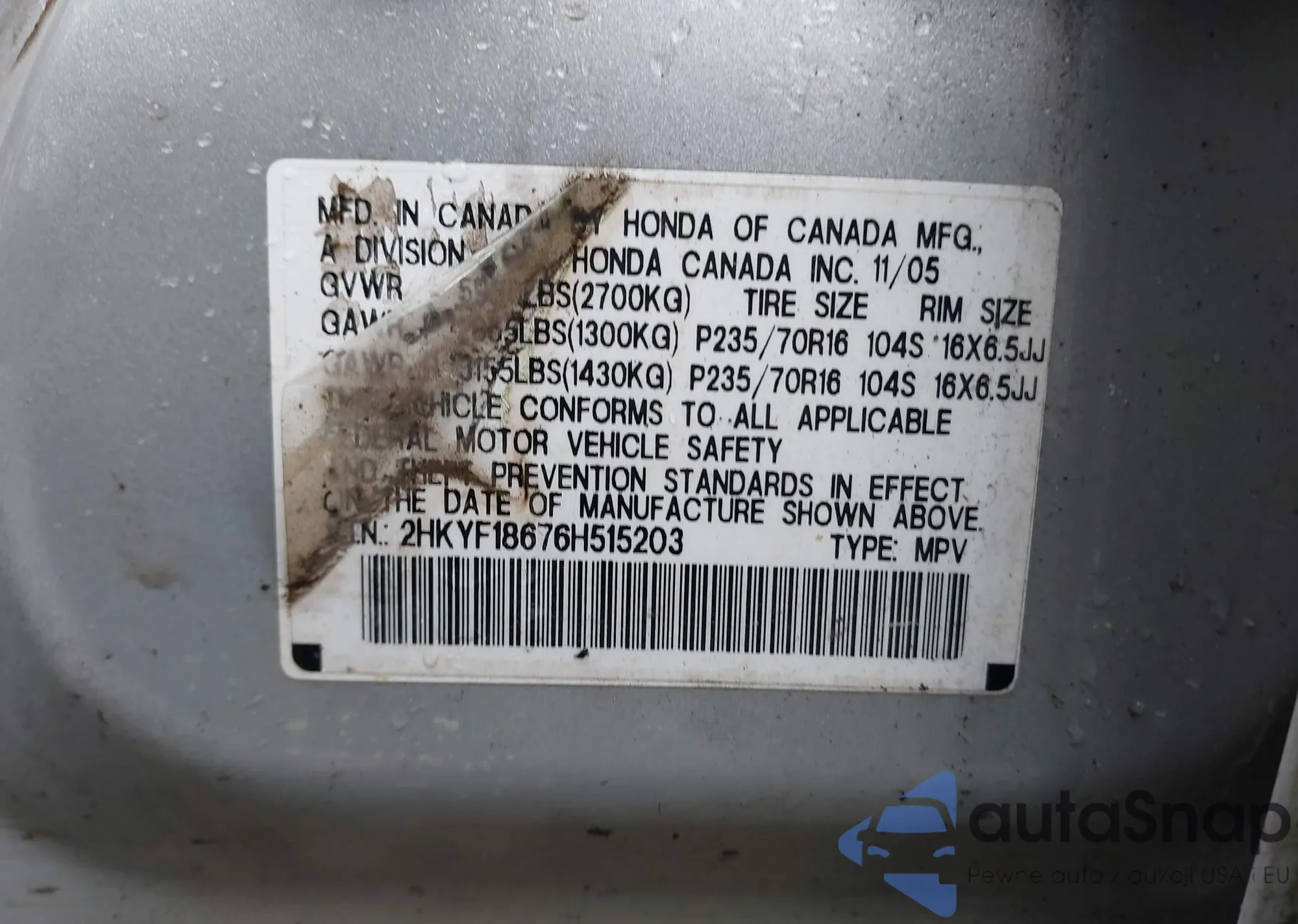 • VIN 2HKYF18676H515203