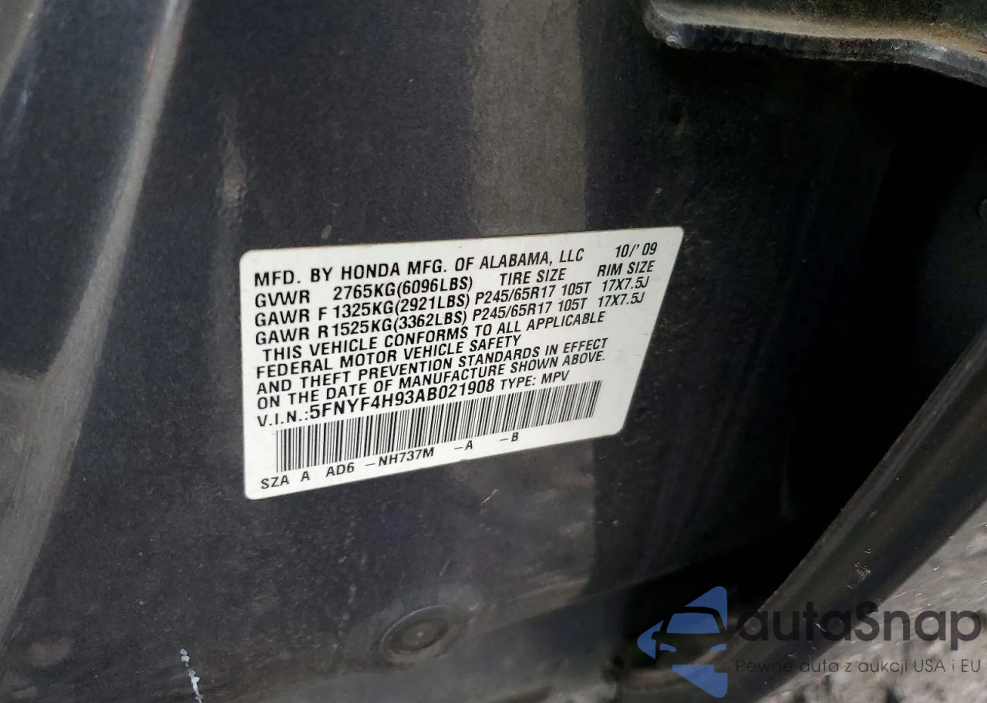 • VIN 5FNYF4H93AB021908