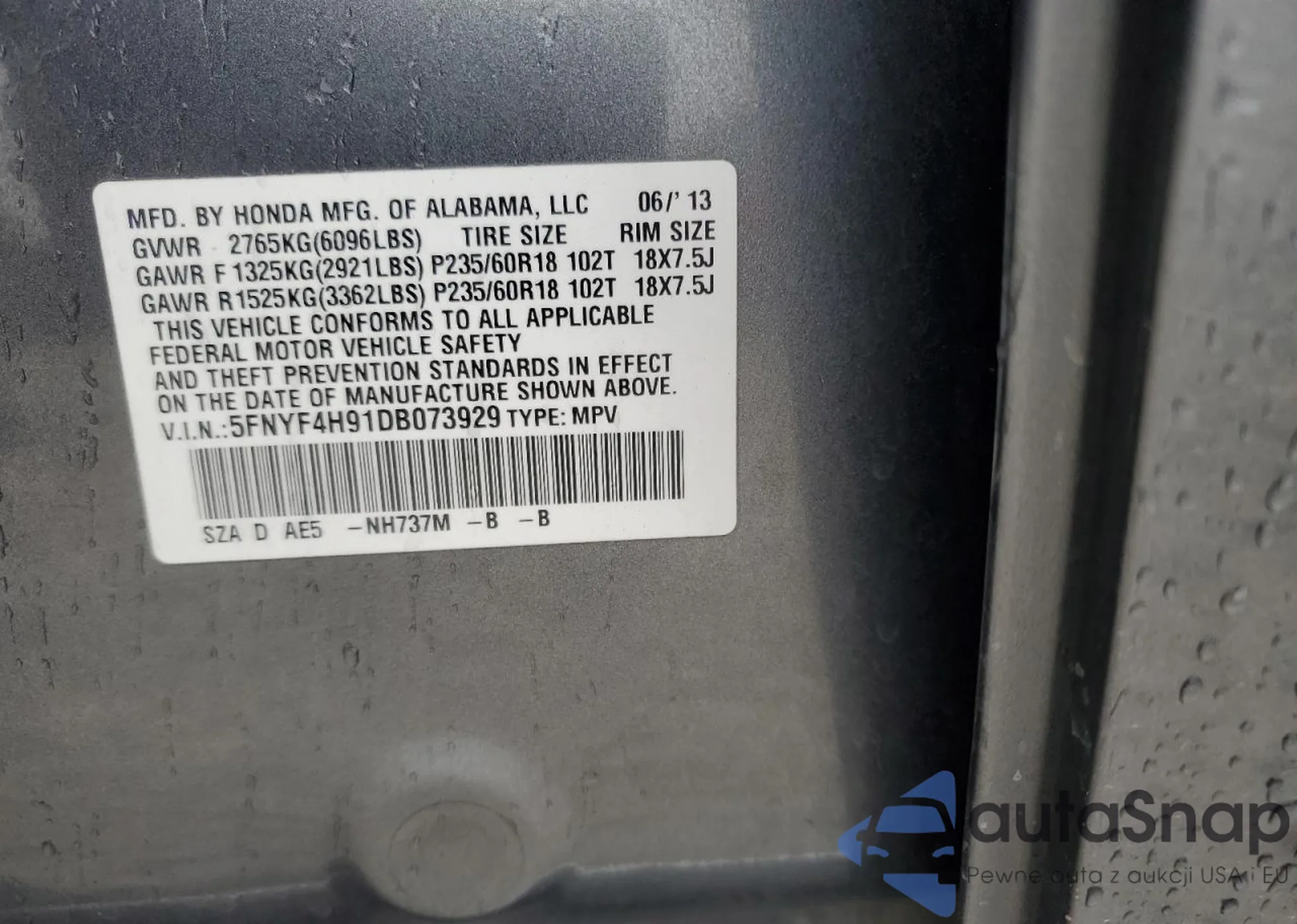 LOT: 92060885 VIN: 5FNYF4H91DB073929