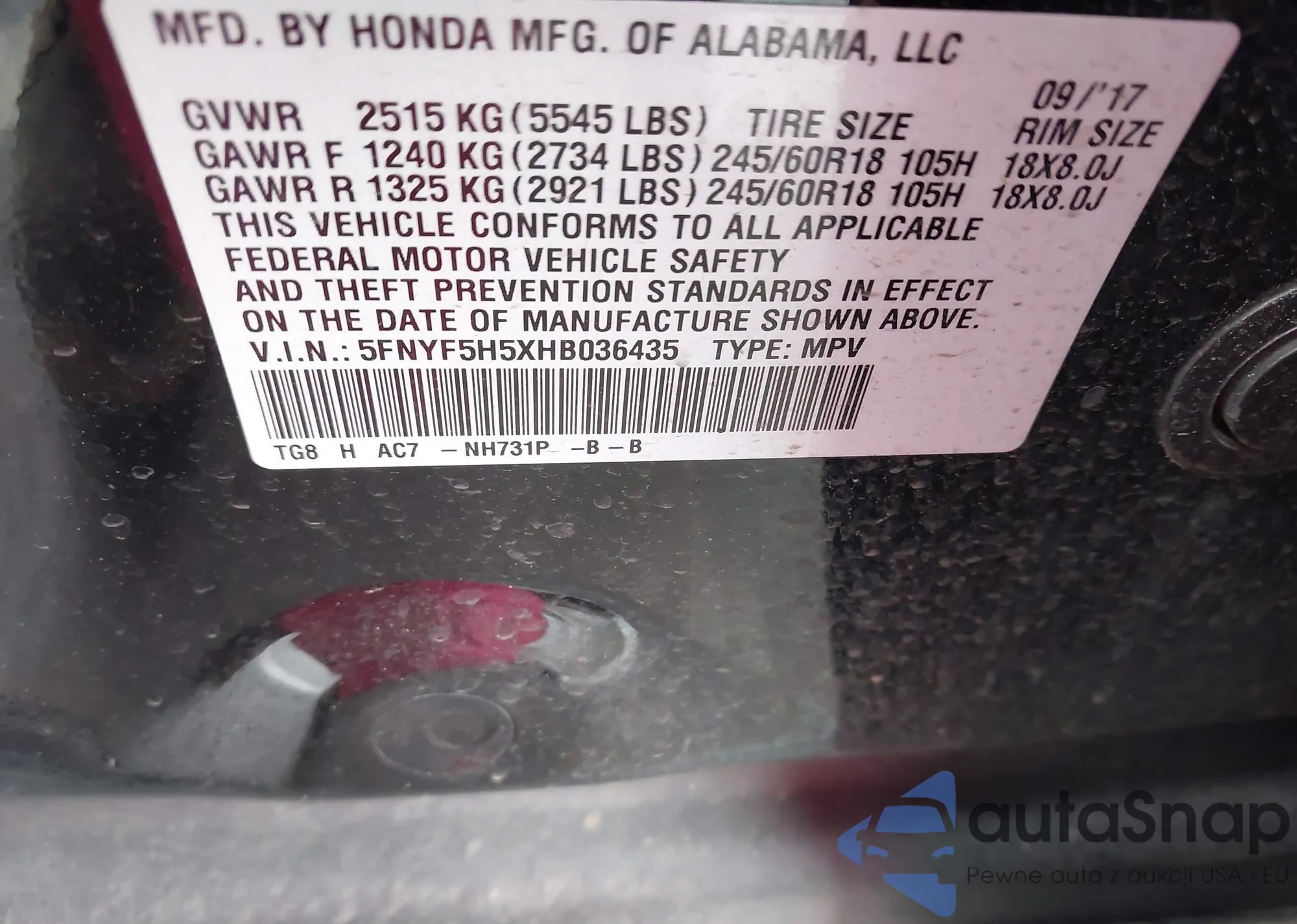 • VIN 5FNYF5H5XHB036435