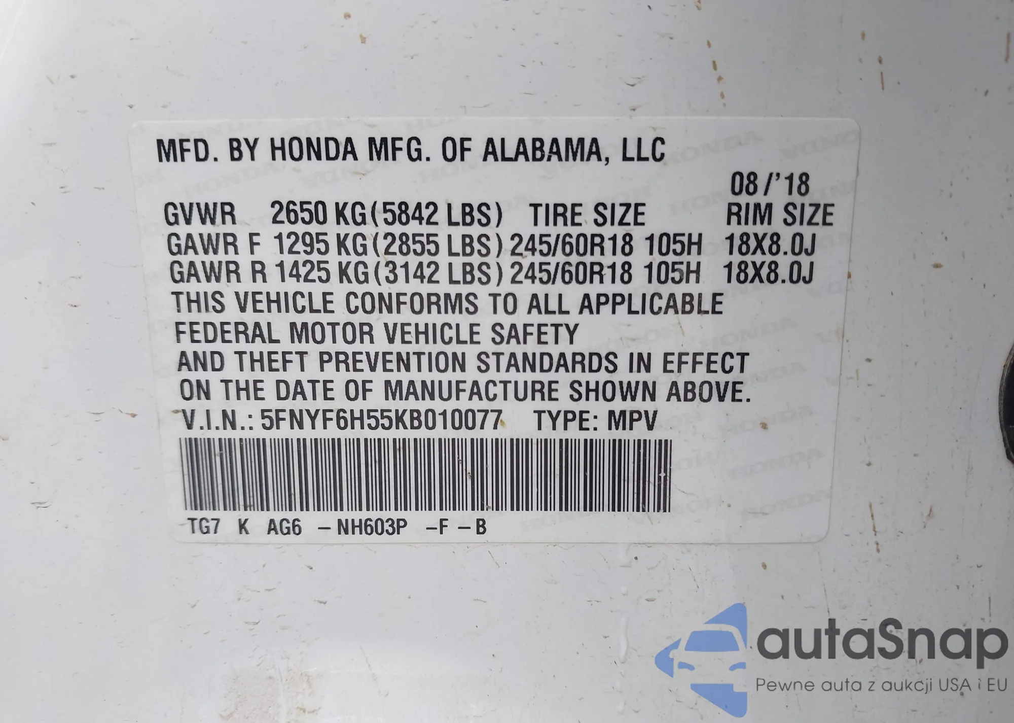LOT: 44100753 VIN: 5FNYF6H53JB036966