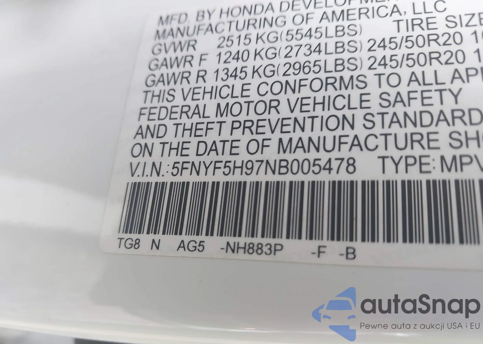 • VIN 5FNYF5H97NB005478